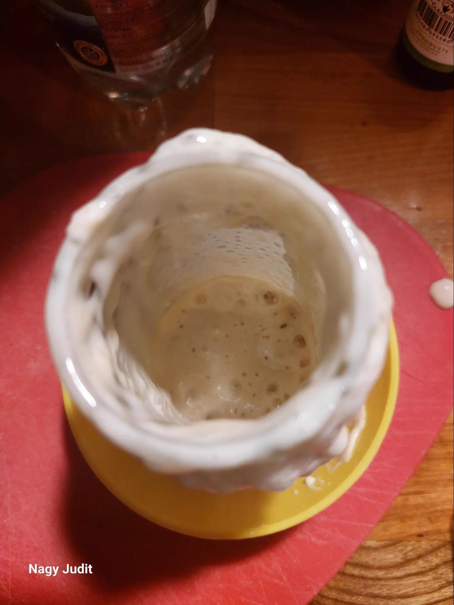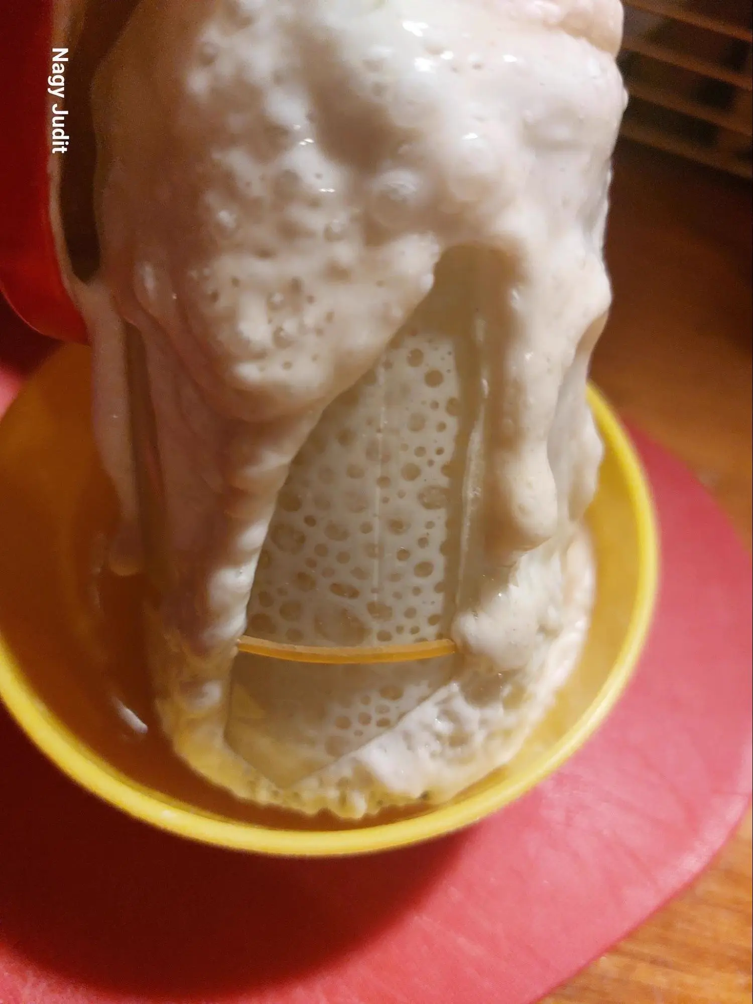 Másnap reggel a tetején már látszottak buborékok. Nőni még nem nőtt, de mivel a bubik megjelentek igy alaposan összekevertem. Aznap este már mutatott növekedést az íze finom édeskés egy enyhe kesernyés mellék ízzel. Ismét alaposan összekevertem.