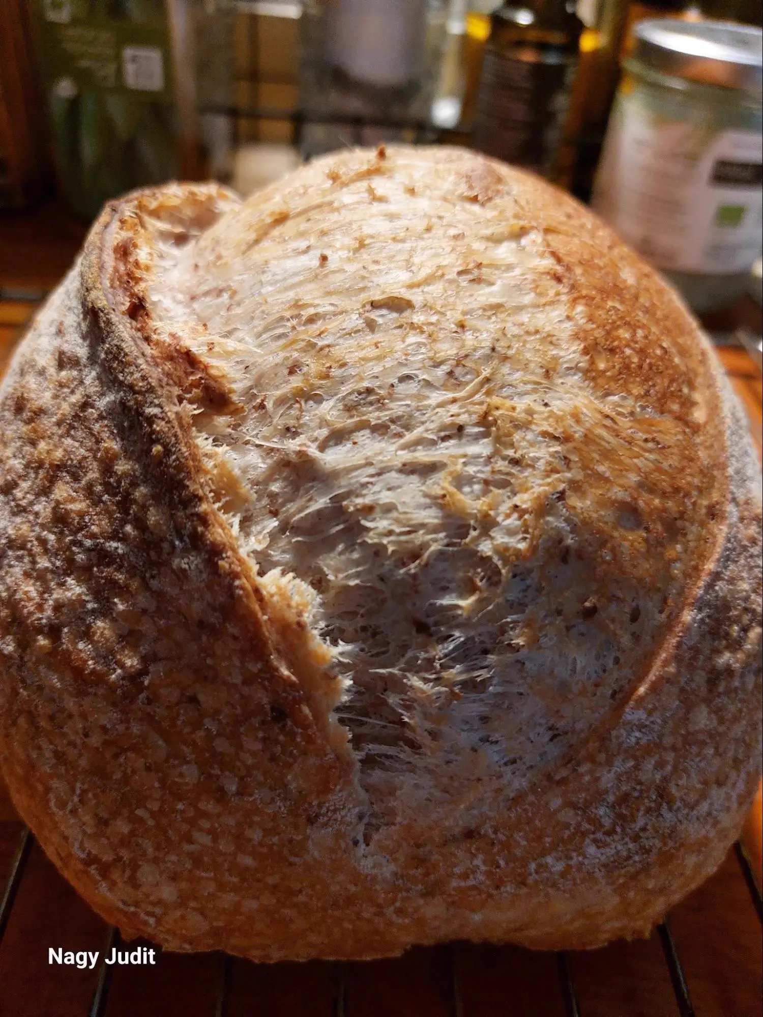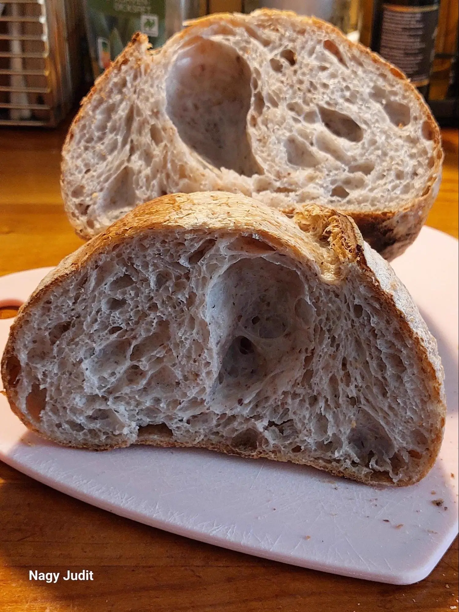 Nagyon elégedett voltam vele, csodásan dolgozott végig a tészta. A nagy lyuk az én hibám mert túl finoman formáztam, de a szerkezete csodás lett.