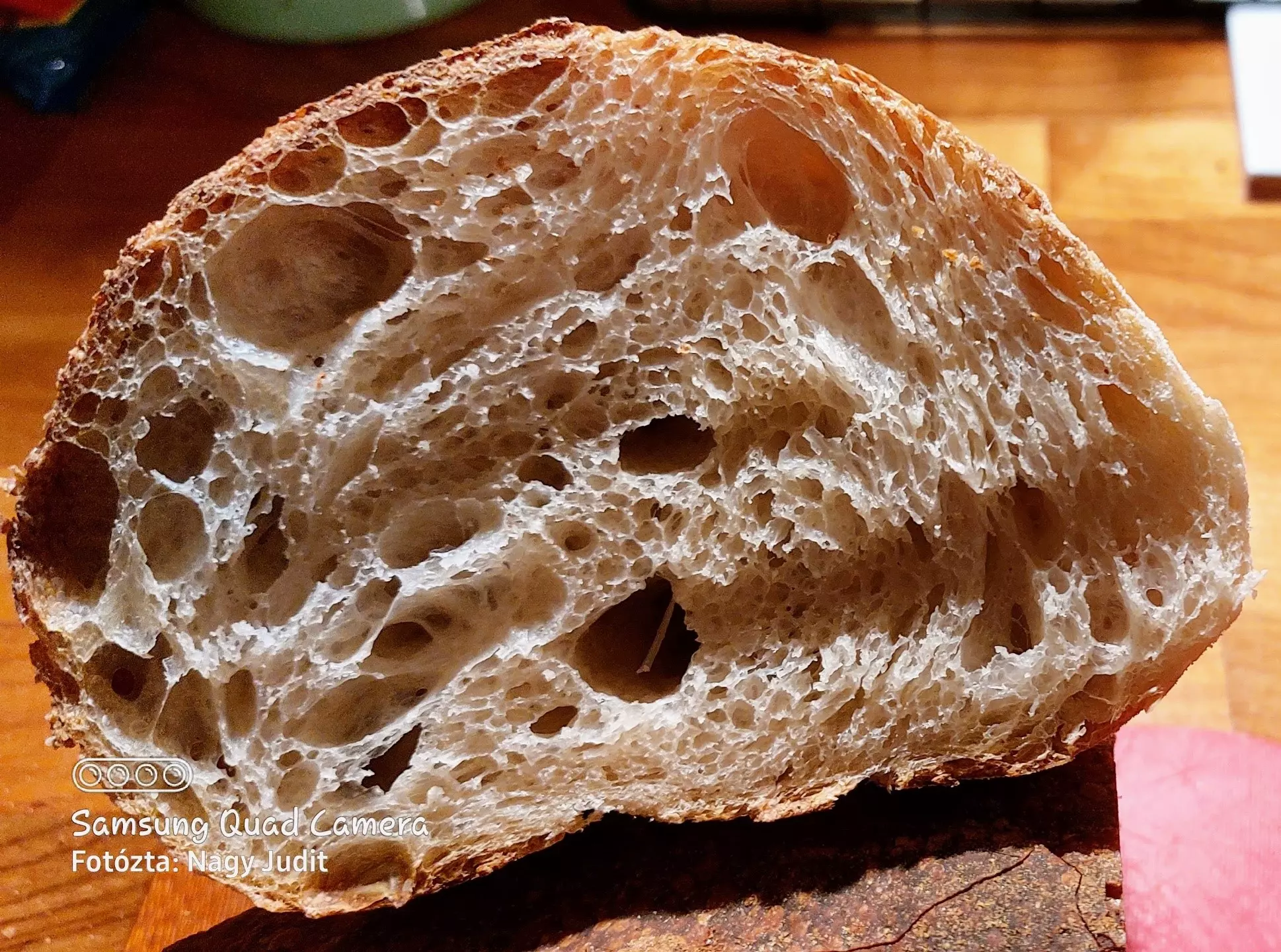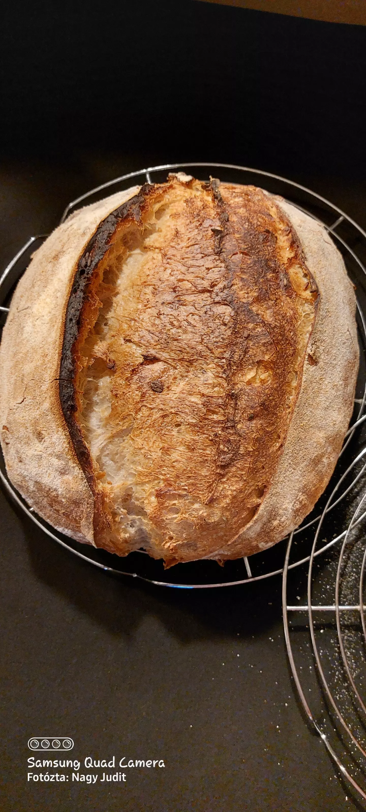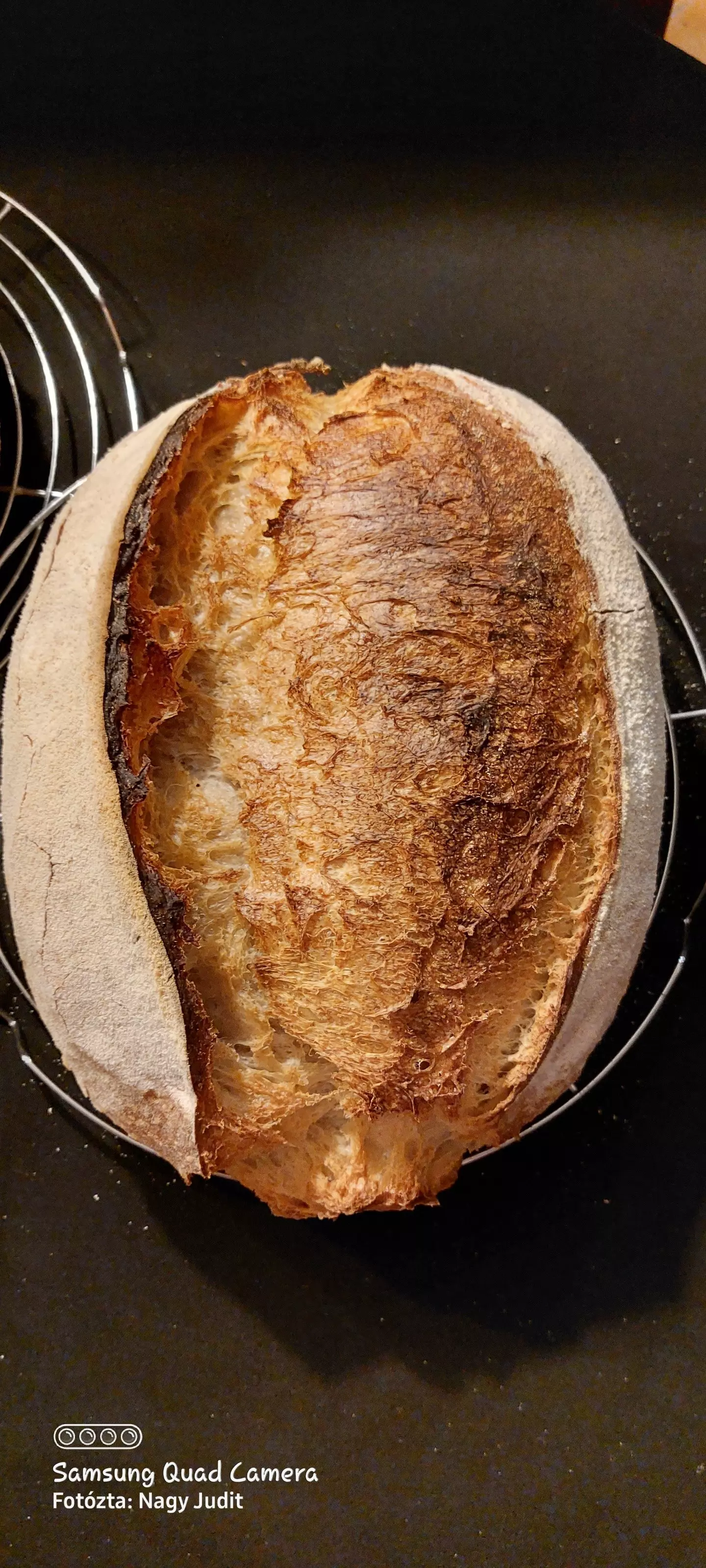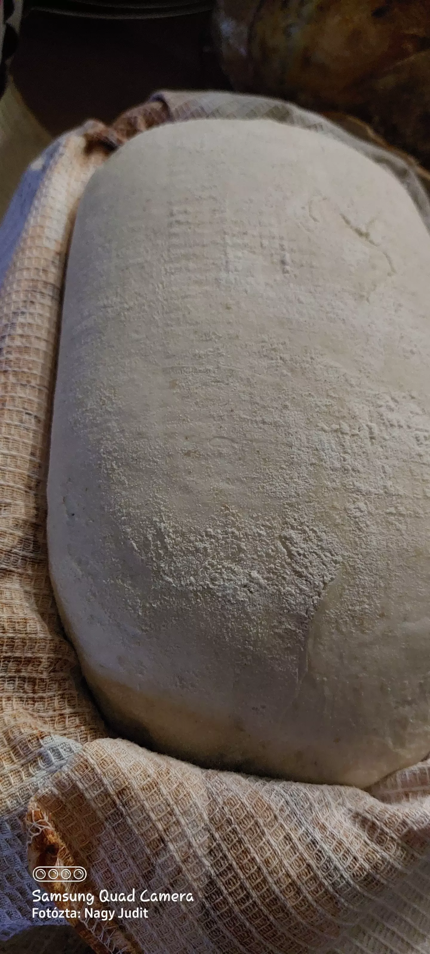 Délután újabb bevetésen a madre! Igy újra etettem 2 óra mulva hűtő. Dagadztás az előzőek szerint annyi válltozás hogy nem került bele tk liszt csak világosak és sajnos nem tudom hogy miből mennyi mert a vizet mértem és a madret de a lisztnél nem kapcsoltam visdza a mérleget igy kelkett hozzá még jócskán víz ugy hogy a madre kb 15 % lehetett 5,5 volt a bulk 21 óra hützőzés és összesen 3 óra pult 1 óra formázás után kb 2 óra hűtő után. Ő lett a 2 fele osztott tészta kelesztés után nagyon szép lett!