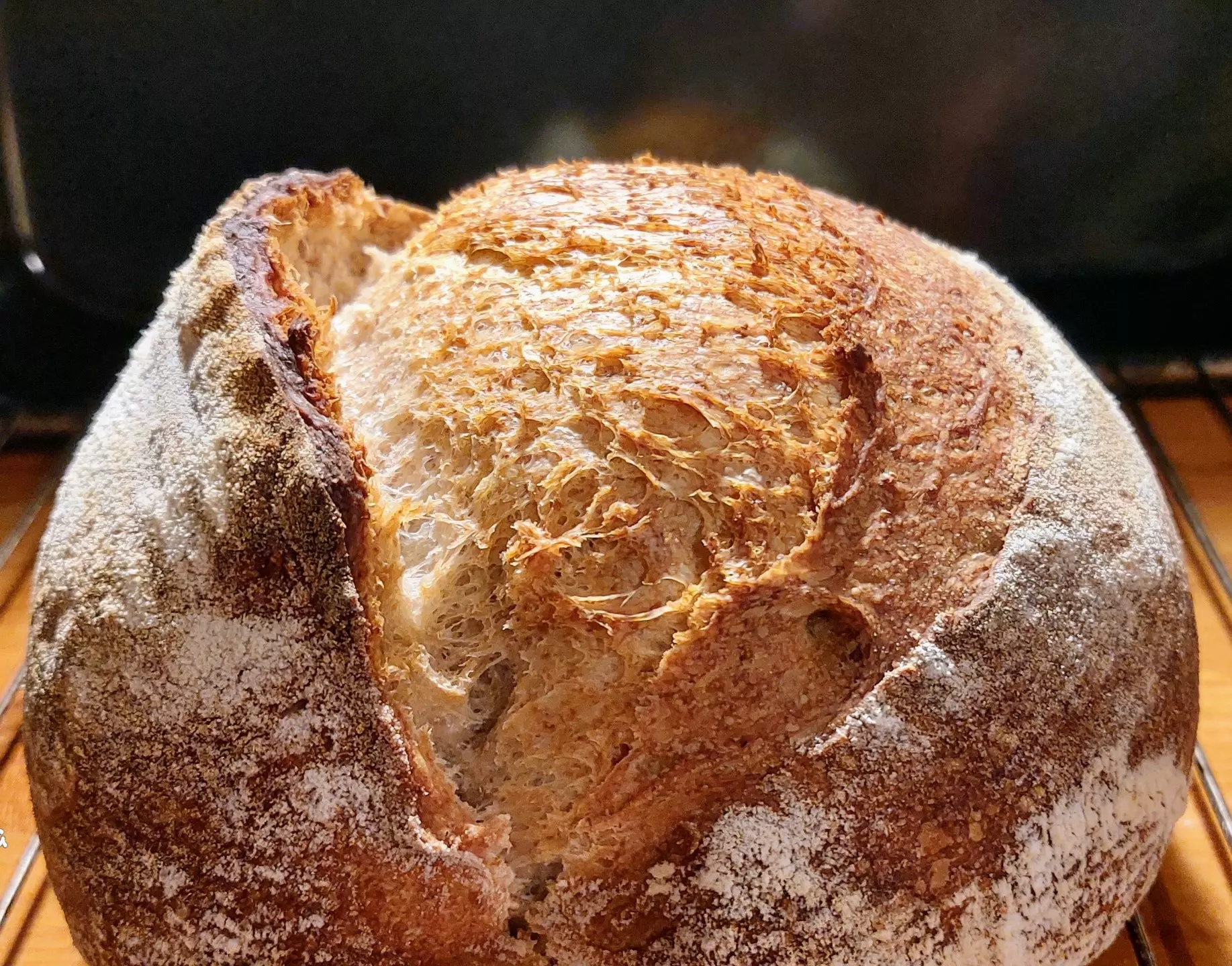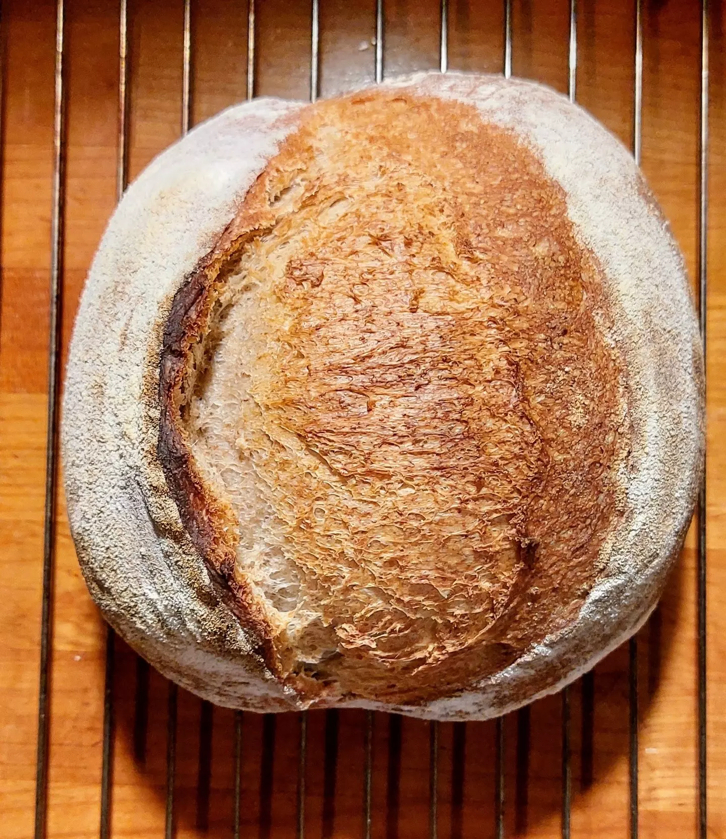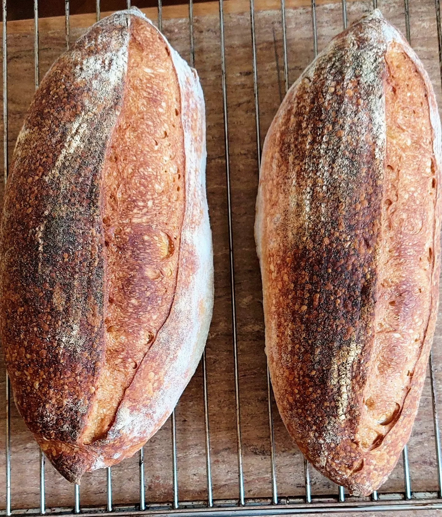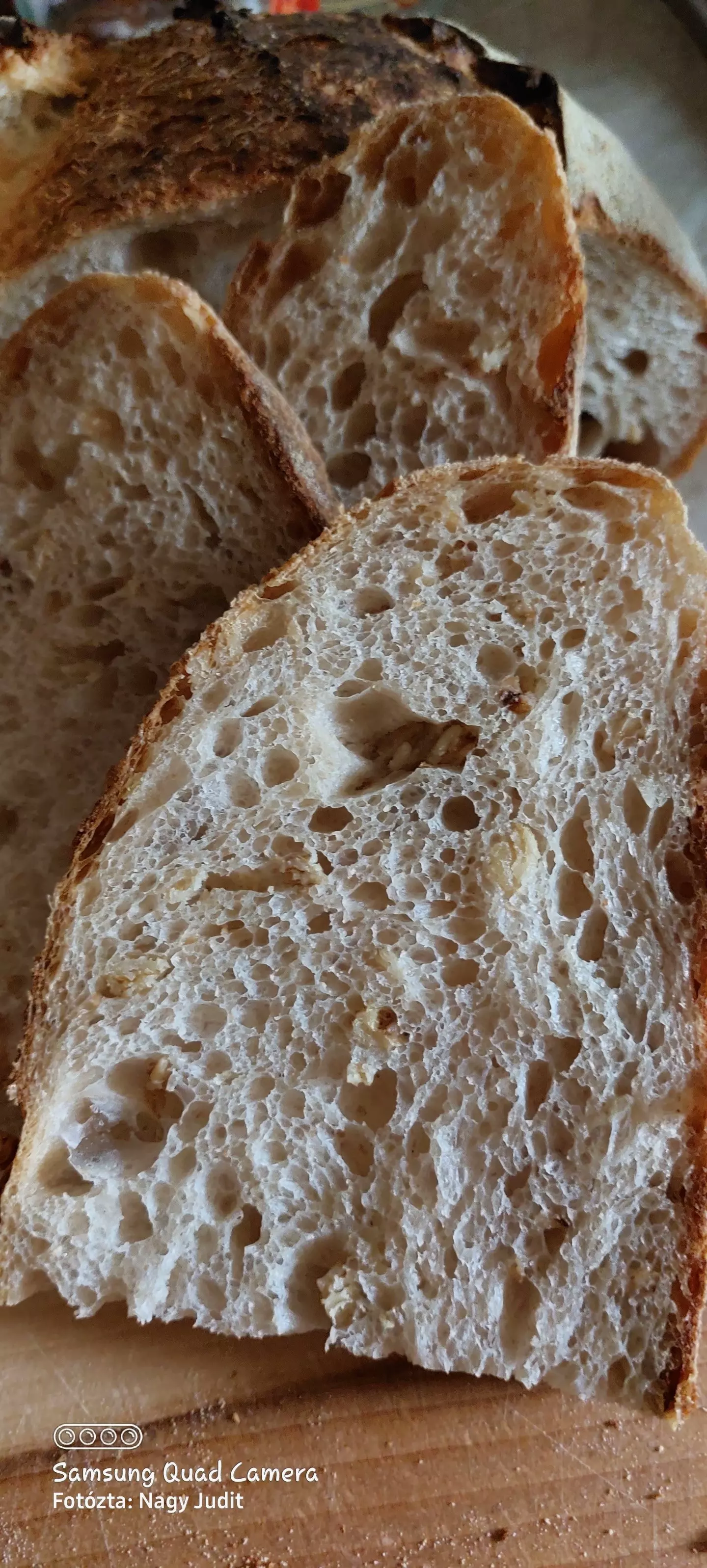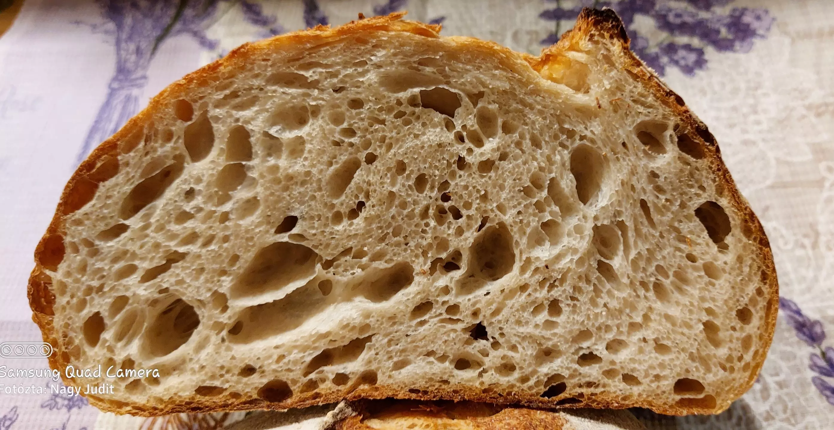Délután újabb bevetésen a madre! Igy újra etettem 2 óra mulva hűtő. Dagadztás az előzőek szerint annyi válltozás hogy nem került bele tk liszt csak világosak és sajnos nem tudom hogy miből mennyi mert a vizet mértem és a madret de a lisztnél nem kapcsoltam visdza a mérleget igy kelkett hozzá még jócskán víz ugy hogy a madre kb 15 % lehetett 5,5 volt a bulk 21 óra hützőzés és összesen 3 óra pult 1 óra formázás után kb 2 óra hűtő után. Ő lett a 2 fele osztott tészta kelesztés után nagyon szép lett!