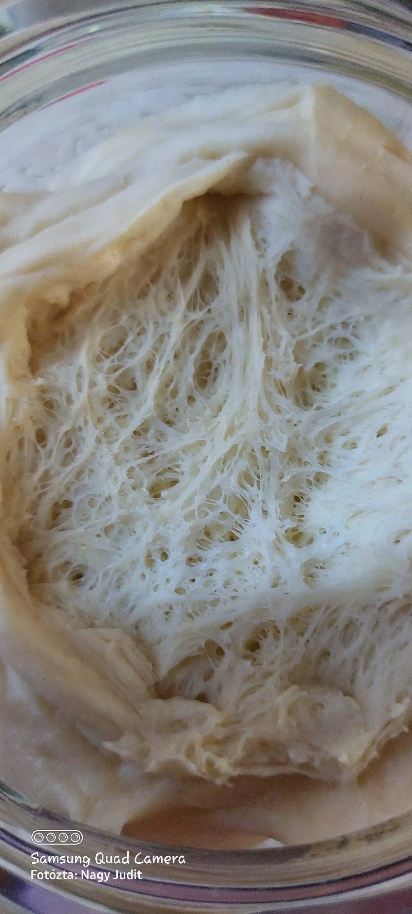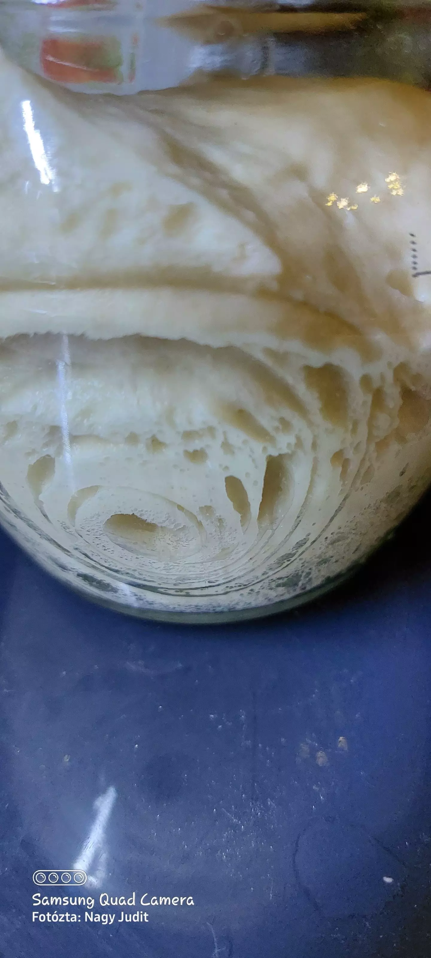 Egy homogén tésztát kapunk pulton 3x kis pihenőkkel jól átgyurjuk mintha feltekernénk majd golyót formázunk és megy a tiszta üvegbe ugyanugy nem csavarjuk rá a tetőt hagyjuk pihenni 24-48 órát. Több mint duplájára nől.