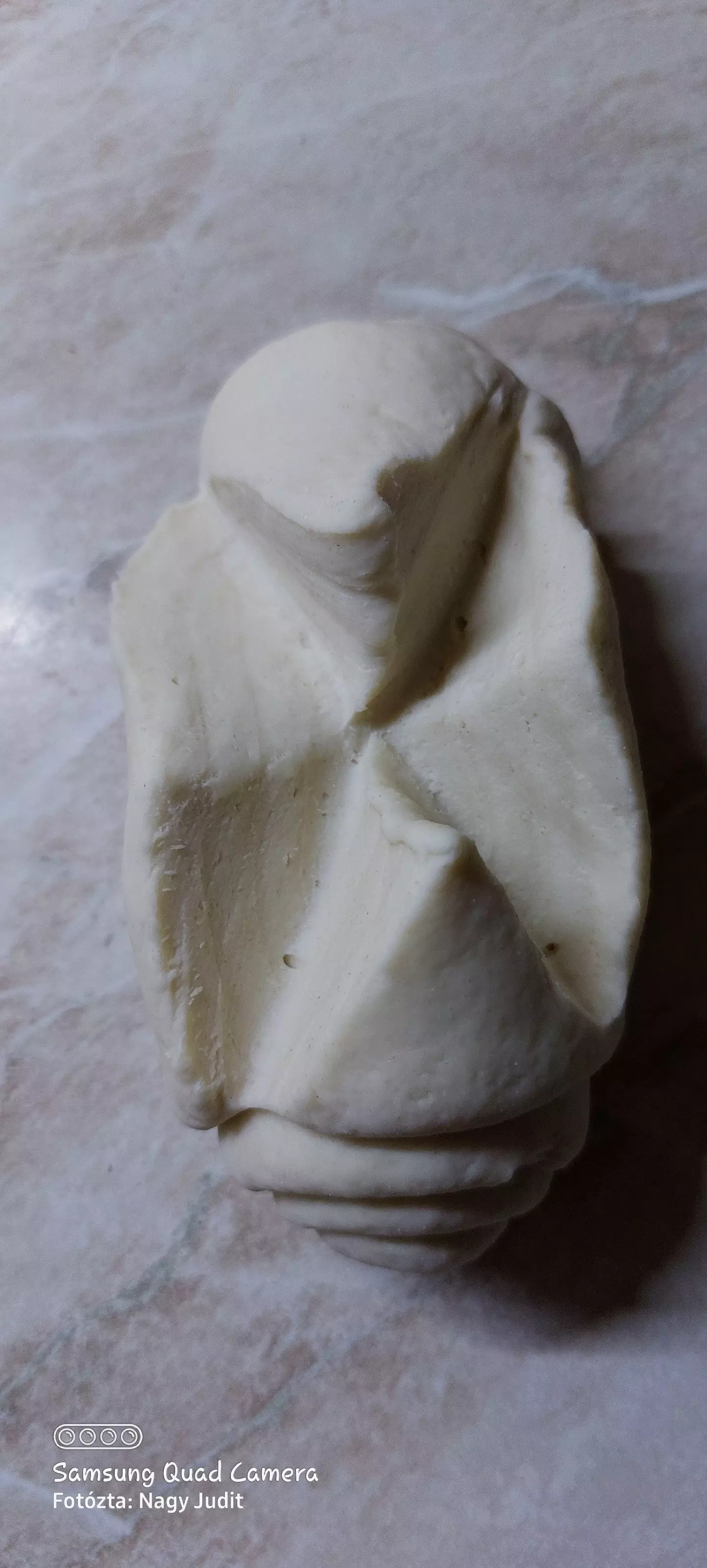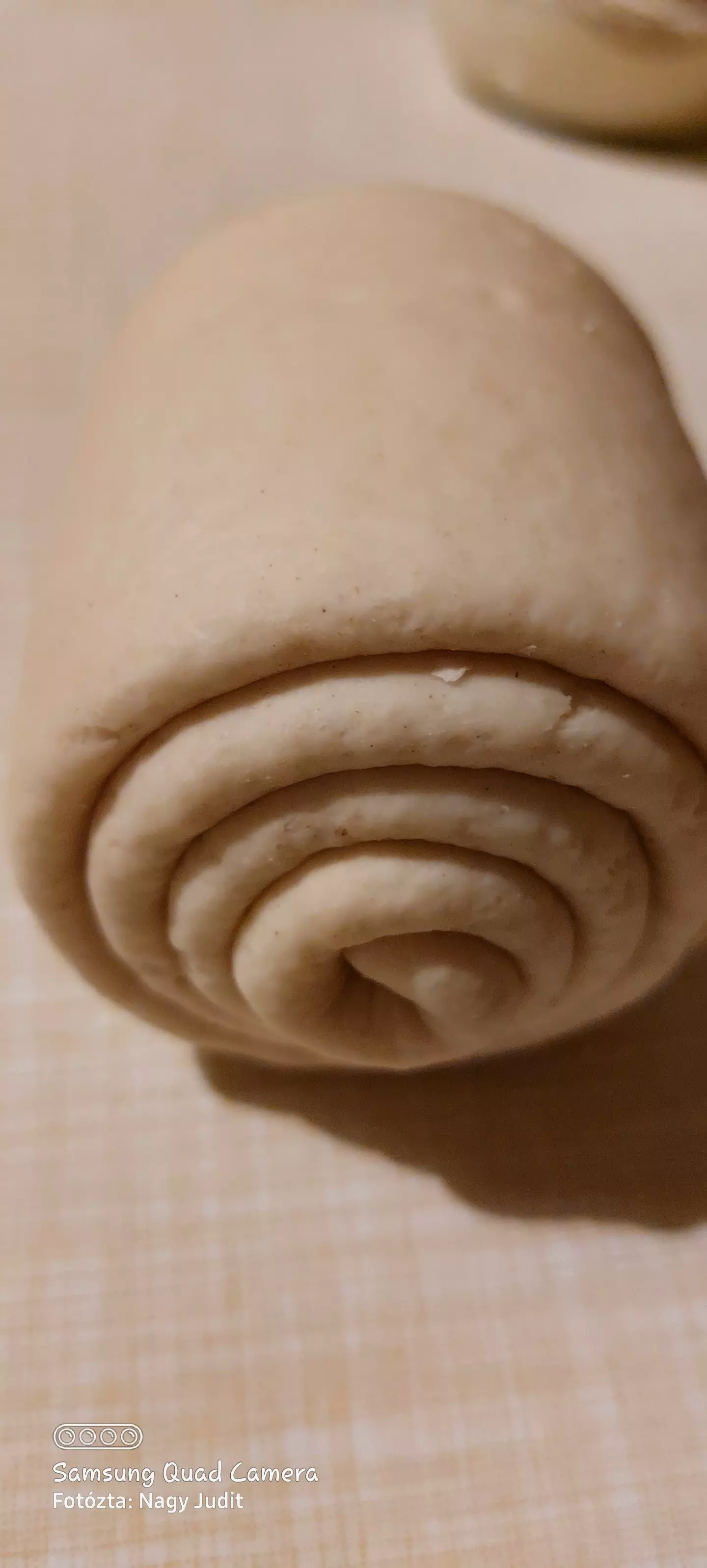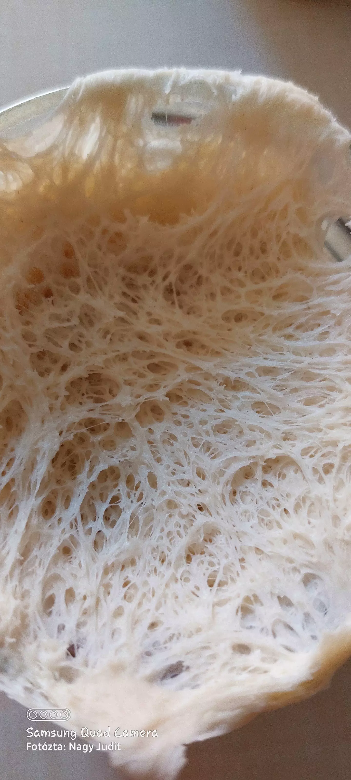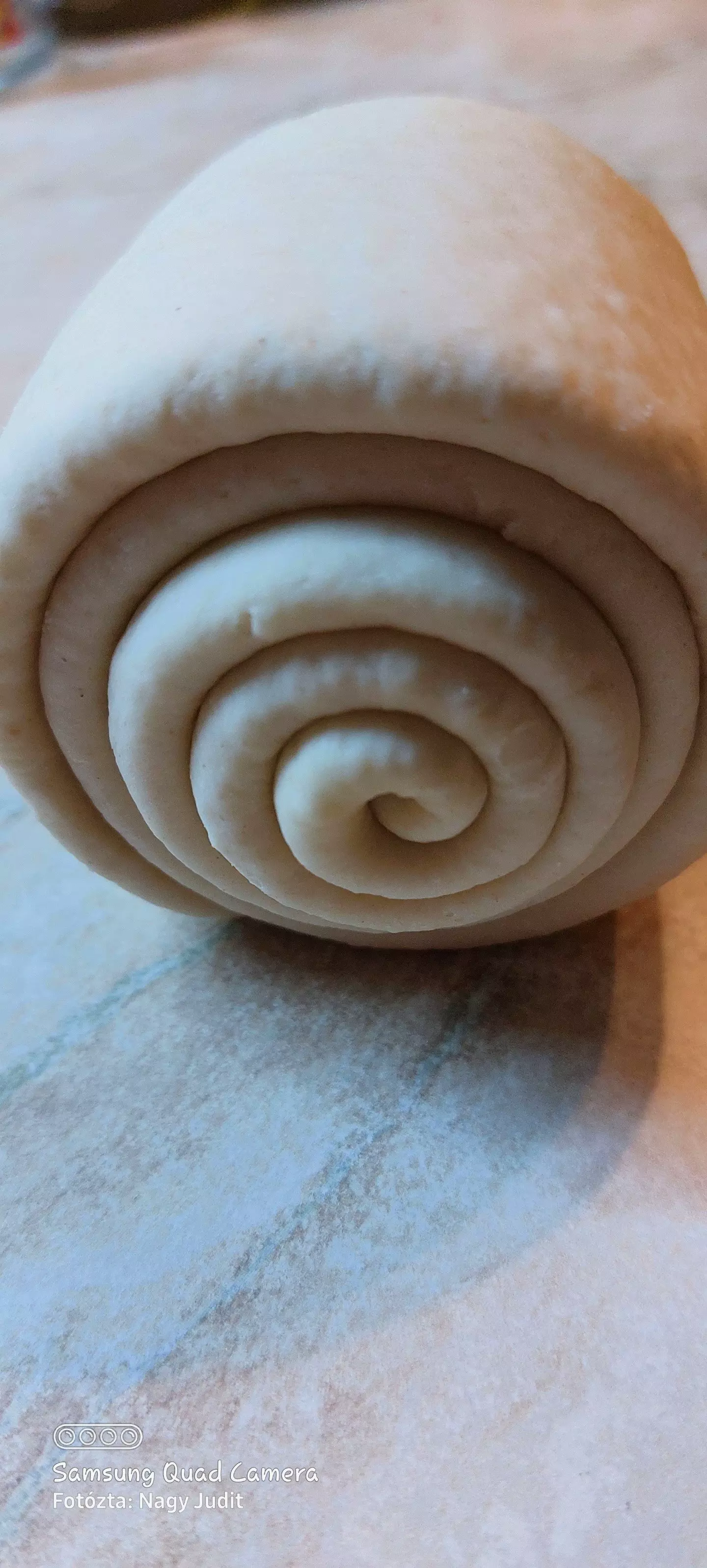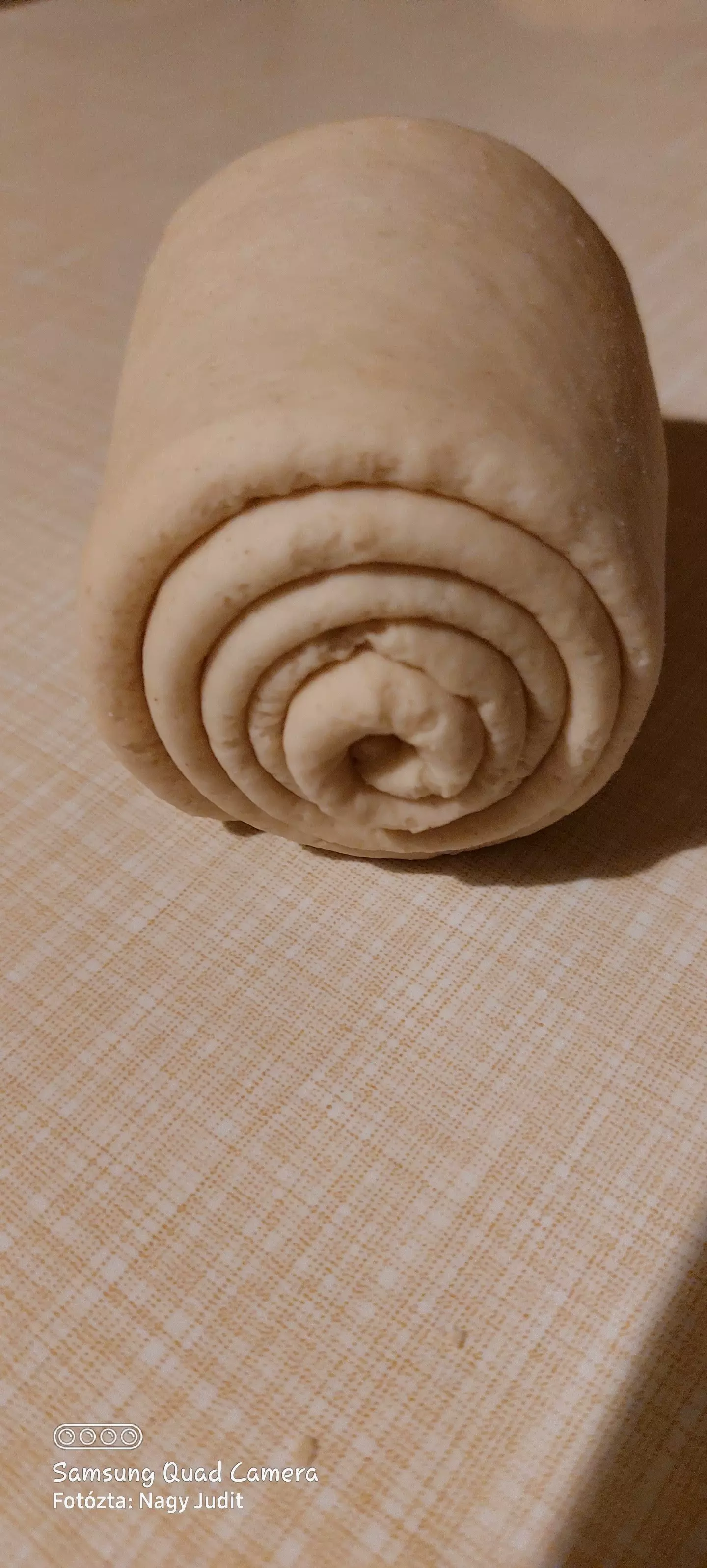 Korábbiak szerint megetetve 3x pogácsa hajtás kis nyujtásokkal majd kicsit vékonyabra nyujtás 2 oldalról egymásra hajtás szük cdikot kapunk ezt nyujtjuk kb 50 cm hosszúra és feltekerjük. 2 óra pult és megy a hűtőbe. 3 óra jobb lett volna de már kèső volt. Az 5 fokos hűtő nem igazán tetszik neki a 8 fok pedig már inkább sok valahol a kettő közt kell megtalálni az arany középutat. Éjszaka volt 5 fokon reggel néztem nem igazán fejlődött tovább igy most kicsit kiveszem és csinálok neki kicsit jobb időt!