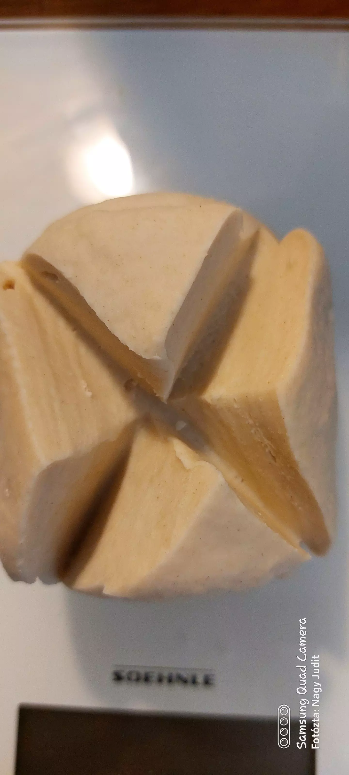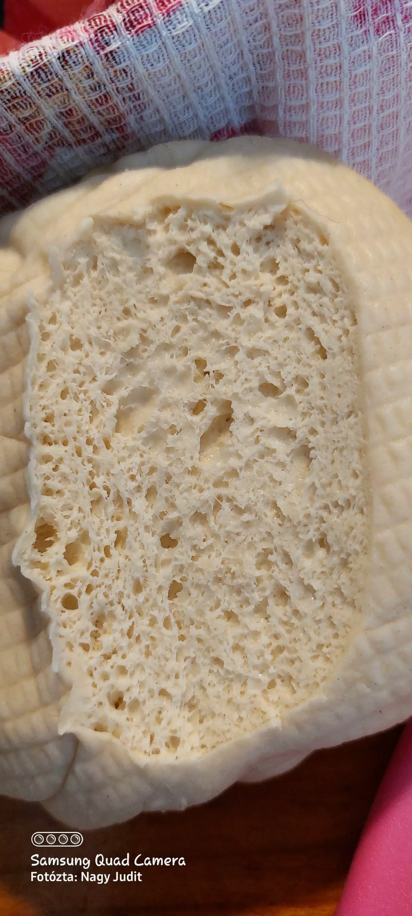 Ugyan ugy mint eddig annyi változással hogy a teteje megszárad és alóla kell a szivéből kivenni az eteni kivánt mennyiséget. Ahogy sa jalapját levettem és szétvágtam egy gyönyörű lyukacsos belső fogadott. 3 óra mulva ment a hűtőbe máshogy nem boldogultam vele. Mire a hűtőbe került márvszépen megnőtt, de óránként meglestem a hűtőbe is és csak nőtt meg nőtt ugy hogy megnyugodtam jóhelye lesz a hidegben. Így megint 48 óra mulva etettem.