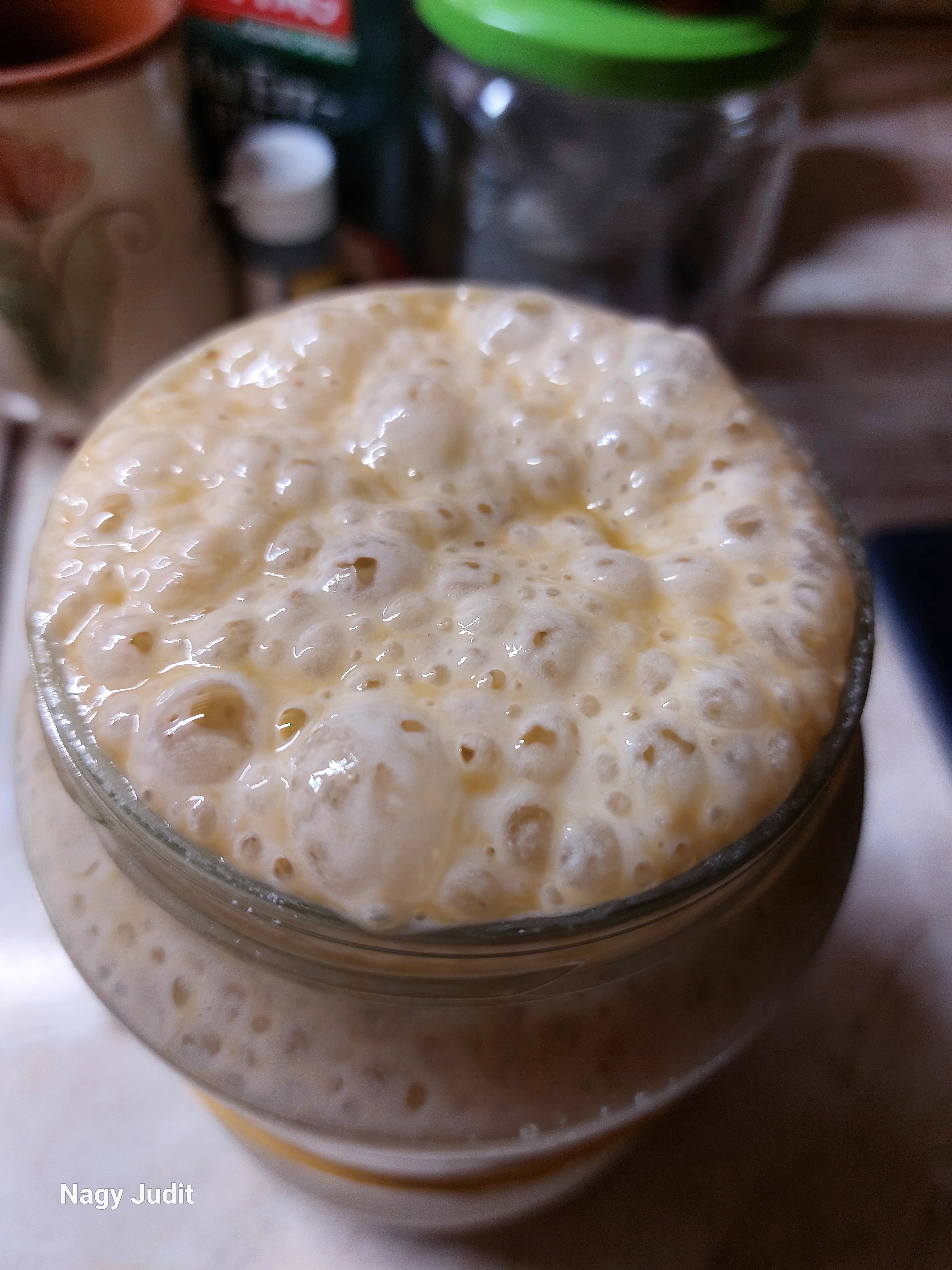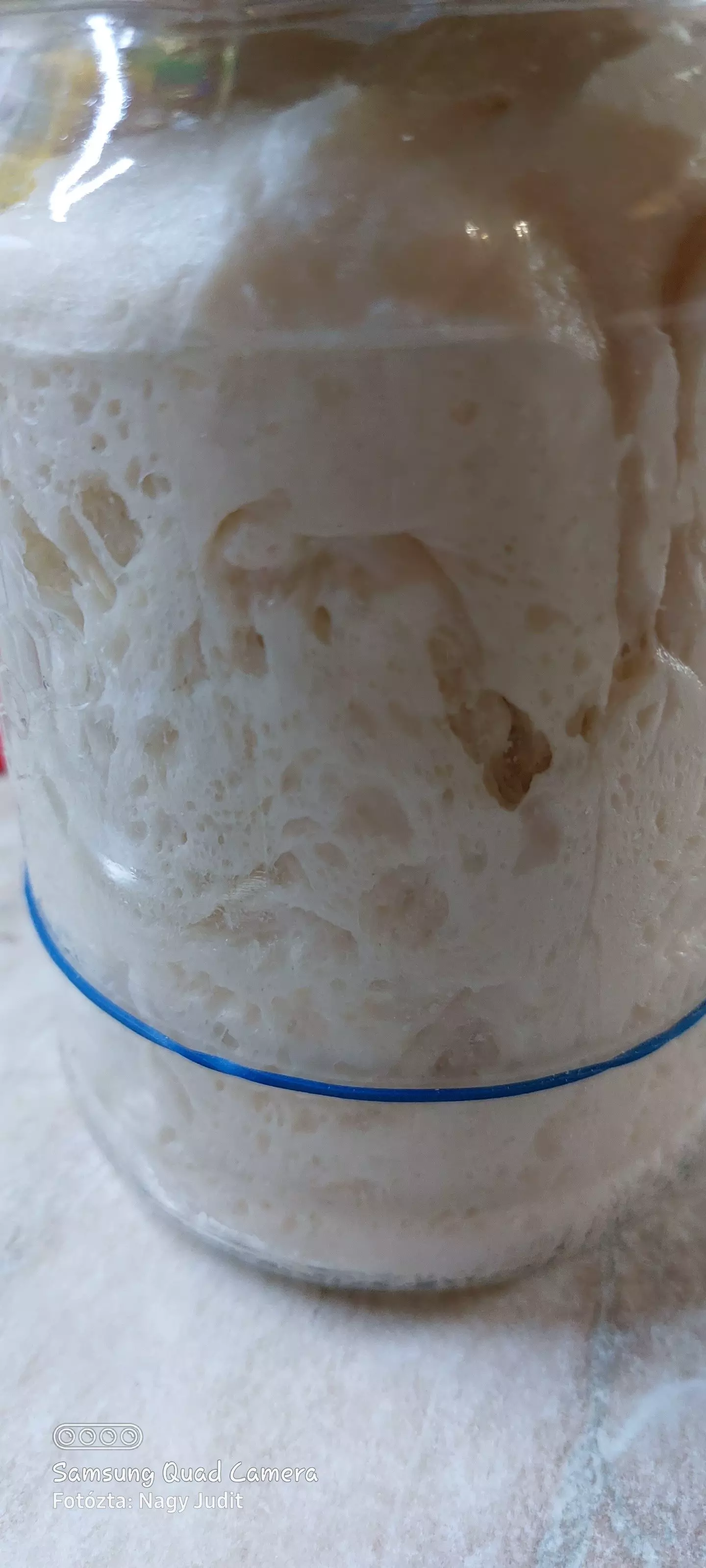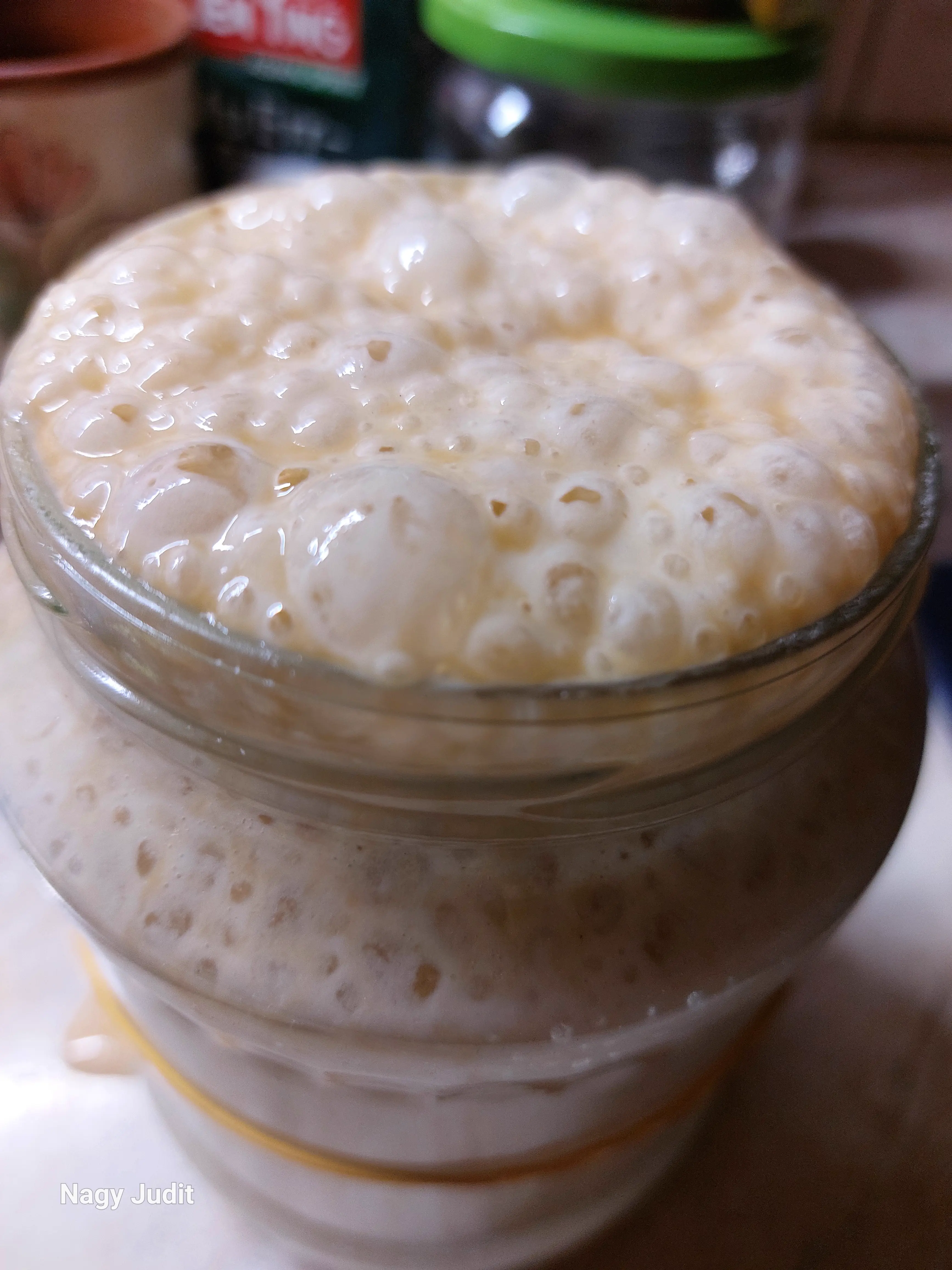 Innentől ugyanugy kezeltem mint az anyát annyi kivétellel hogy üvegbe tettem, a tetőt nem csavartam rá csak rátettem. 2 kenyér készül majd egy pici 50%-ban tk búzalisztes és egy fehér.