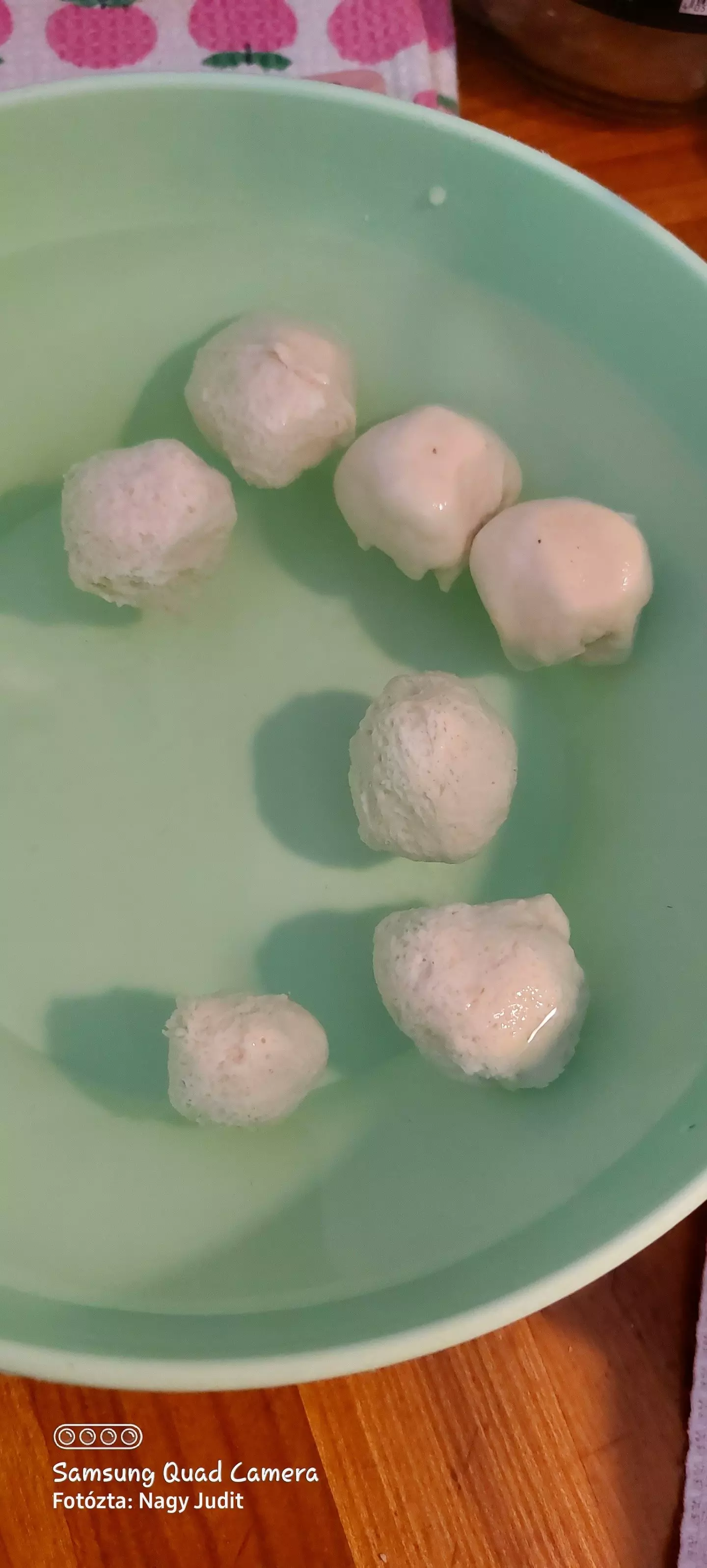 A másik feléből kis golyókat formáztam és beletettem langyos cukros vízbe hogy azt is megtudjam mutatni ha esetleg legyengülne a madre hogy lehet kicsit feltuningolni. Az erősség látszik azon hogy a cukros vízben milyen hamar kezd el lebegni. A z enyém nyilván erős mivel pár perc mulva már a víz tetején úszott pedig előtte a gombócozásnál kinyomtam belőle a levegőt. így nem is hagytam benbe tovább csak a fotó kedvéért fürdettem meg őket. Ahogy nyomkodtam ki belőle a vizet lehet érezni ahogy a buborékok pattogtak szét a madreban.