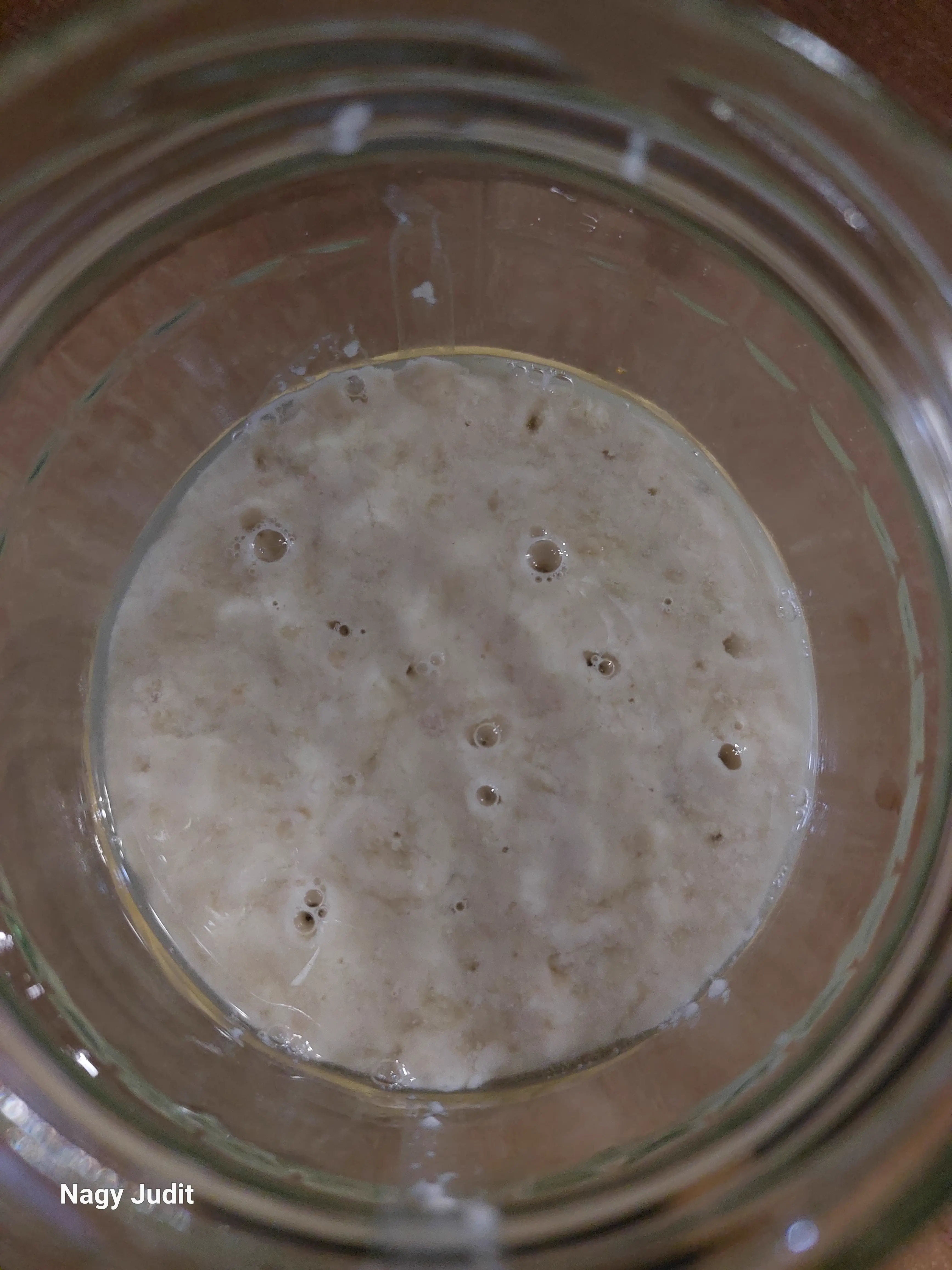 Pár óra múlva megjelent némi víz a keverék tetején, ezért adtam hozzá egy lapos evőkanálnyi manitoba lisztet. Ez meghozta a kívánt eredményt, belobbant a kovász kezdeményünk.