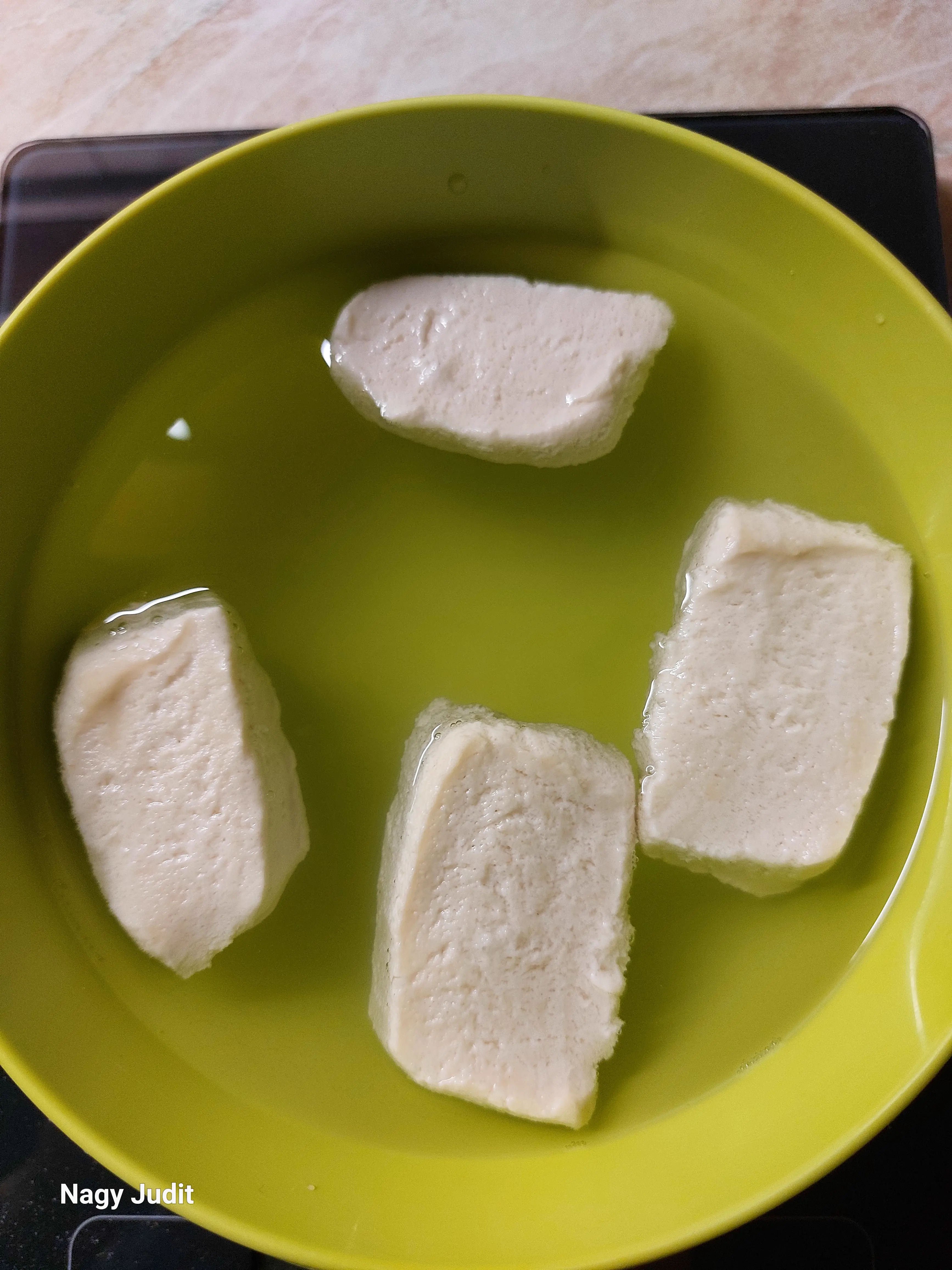 Reggel 7 kor kivettem a hűtőből gyönyörű habos kap fél órát hogy magához térjen és indul a próba. Hagytam ázni a vízben és caak kézzel nyomkodtam szét a madret.
