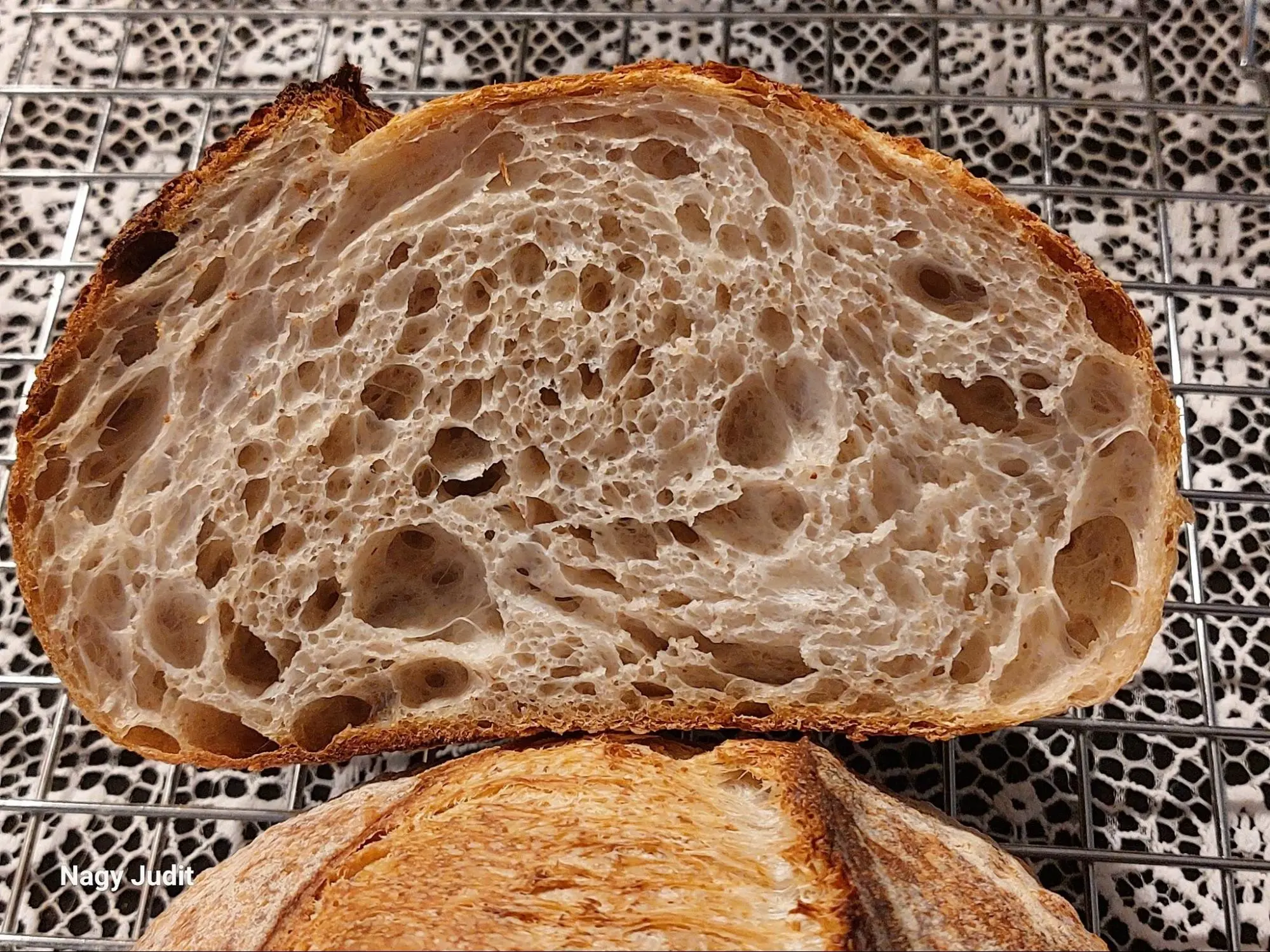 Másnap 16,5 óra hűtőzés után indult a sütés. Az idők itt is csak tájékoztató jellegűek. Nem az órát nézzük hanem a tésztát figyeljük mint minden kovászos pékárunál! A következő fotók a megsült kenyérkémet mutatják. Csodás bélzet, vékony ropogós héj, szép forma. Szép magasra nőtt.