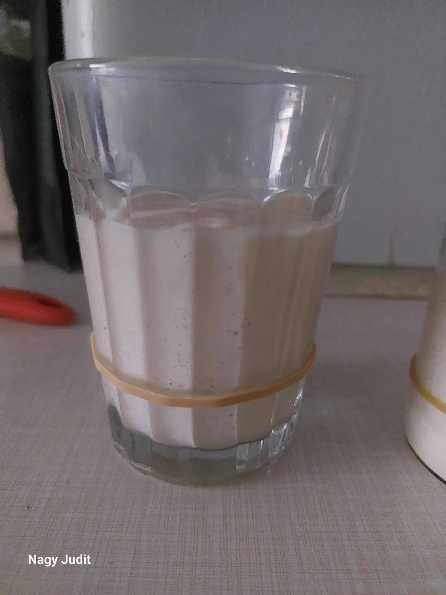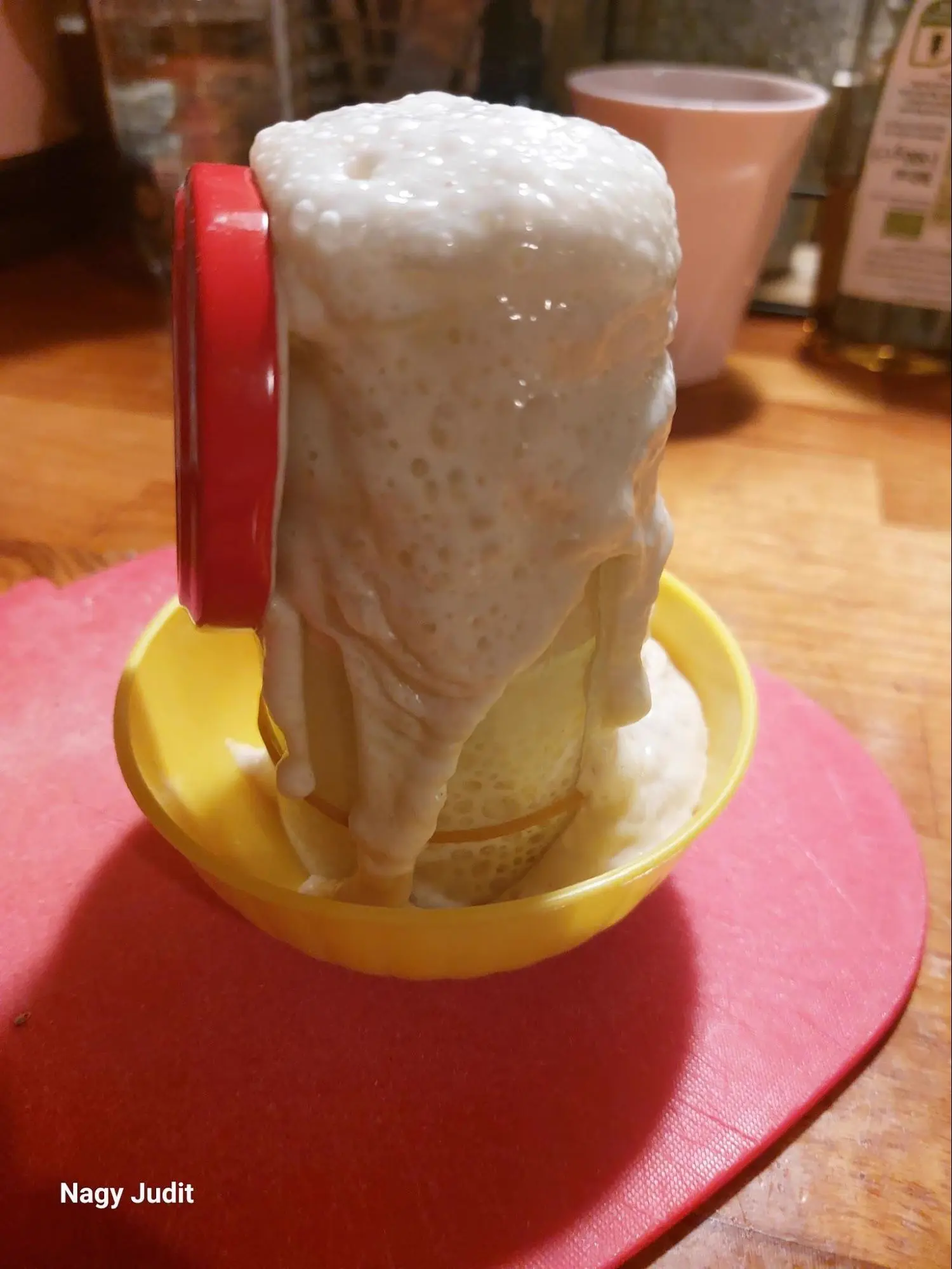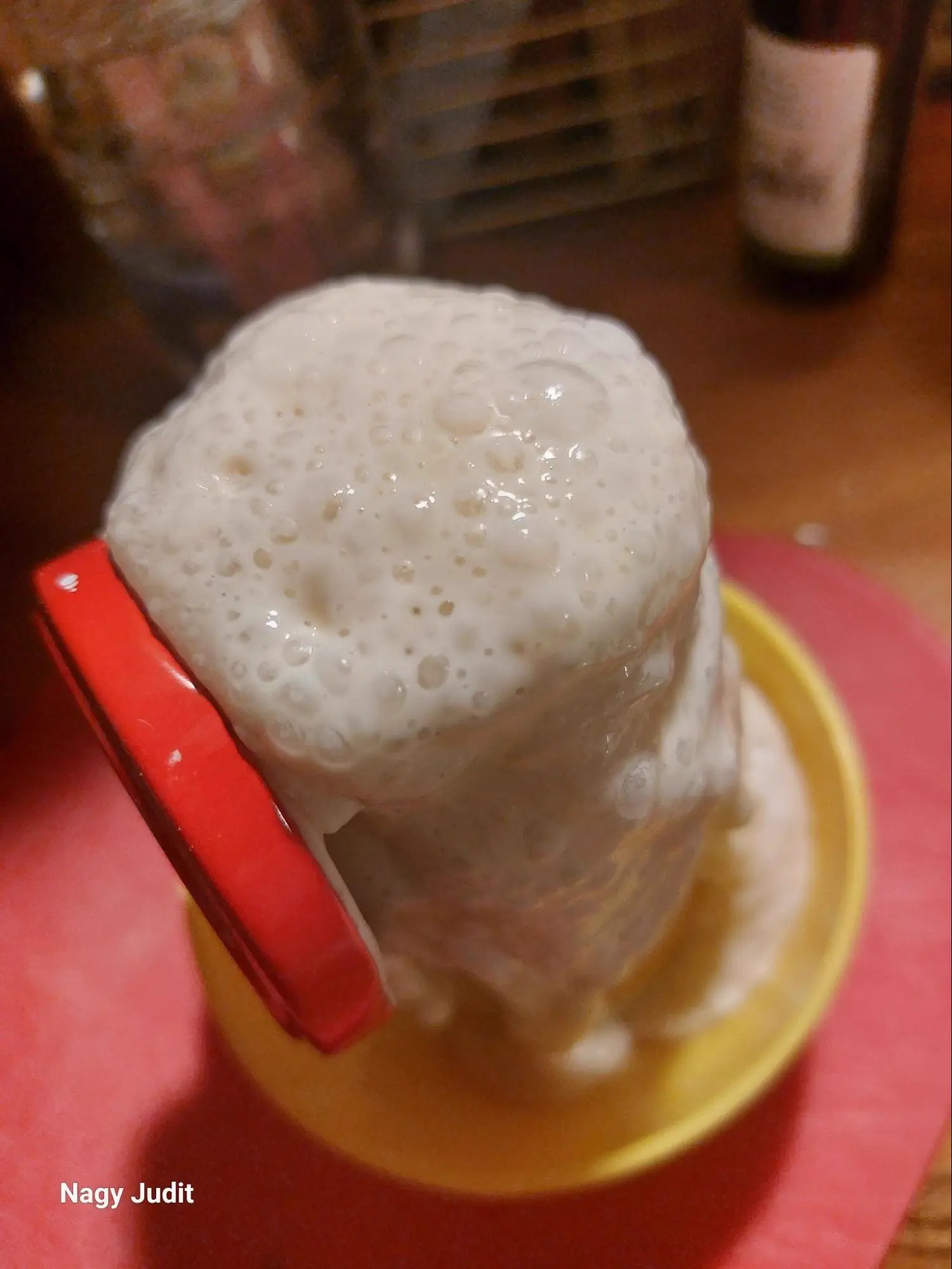 Másnap reggel a tetején már látszottak buborékok. Nőni még nem nőtt, de mivel a bubik megjelentek igy alaposan összekevertem. Aznap este már mutatott növekedést az íze finom édeskés egy enyhe kesernyés mellék ízzel. Ismét alaposan összekevertem.
