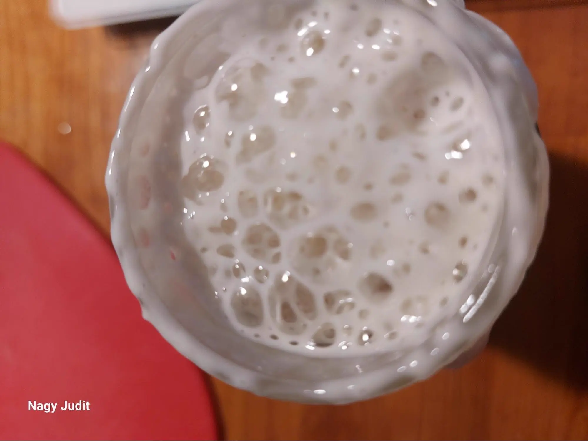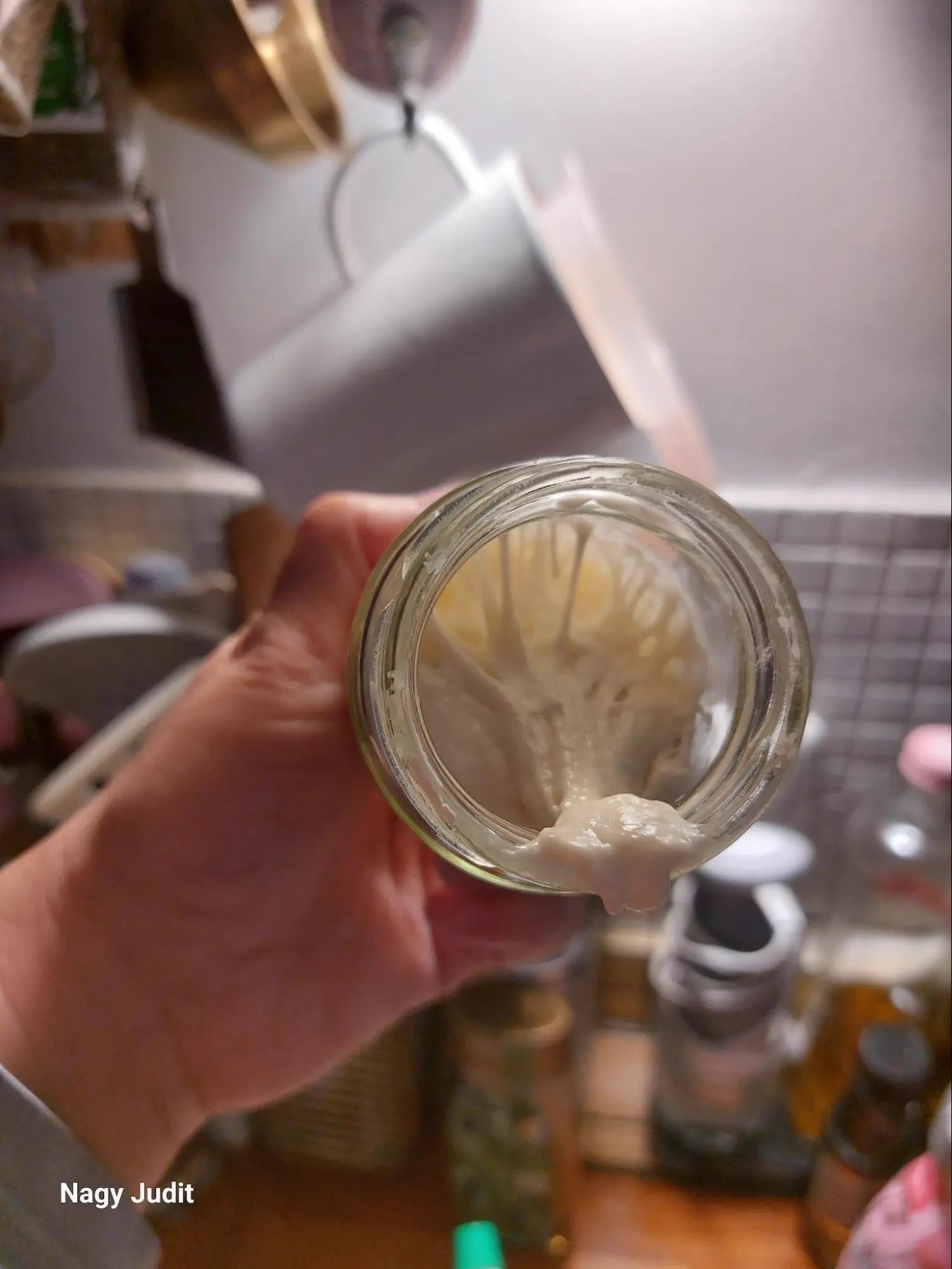 Reggel megint nézegetett az üvegből, de már legalább nem futott ki, legalább is nem annyira mint este. Habos még mindig, nem szálas a kovász. Kisebb arányban etetek.