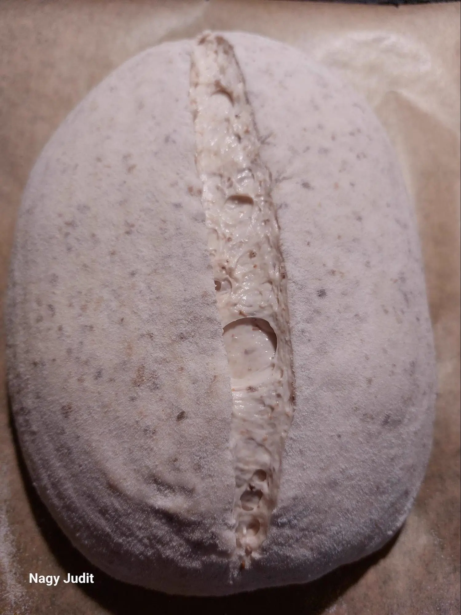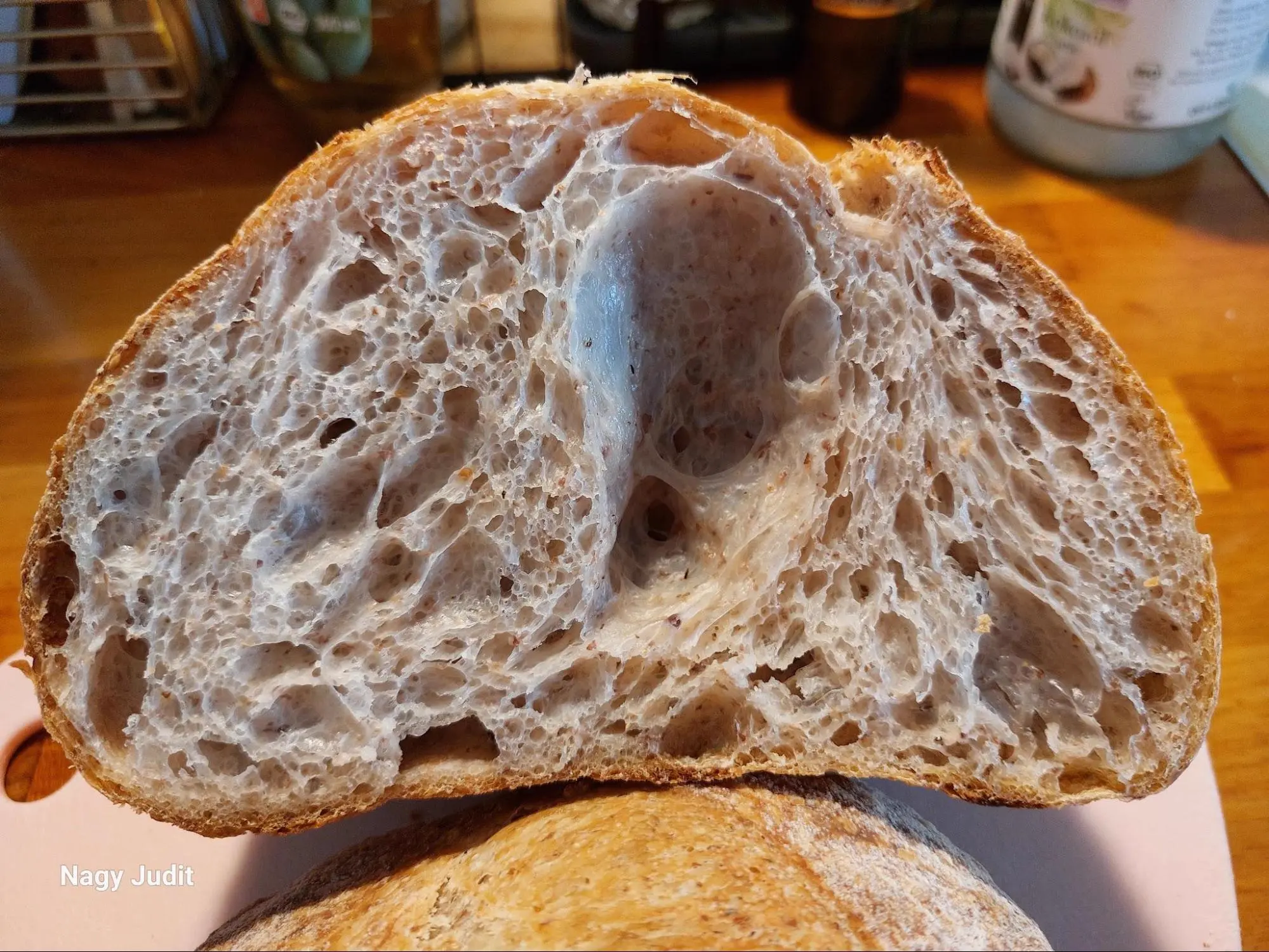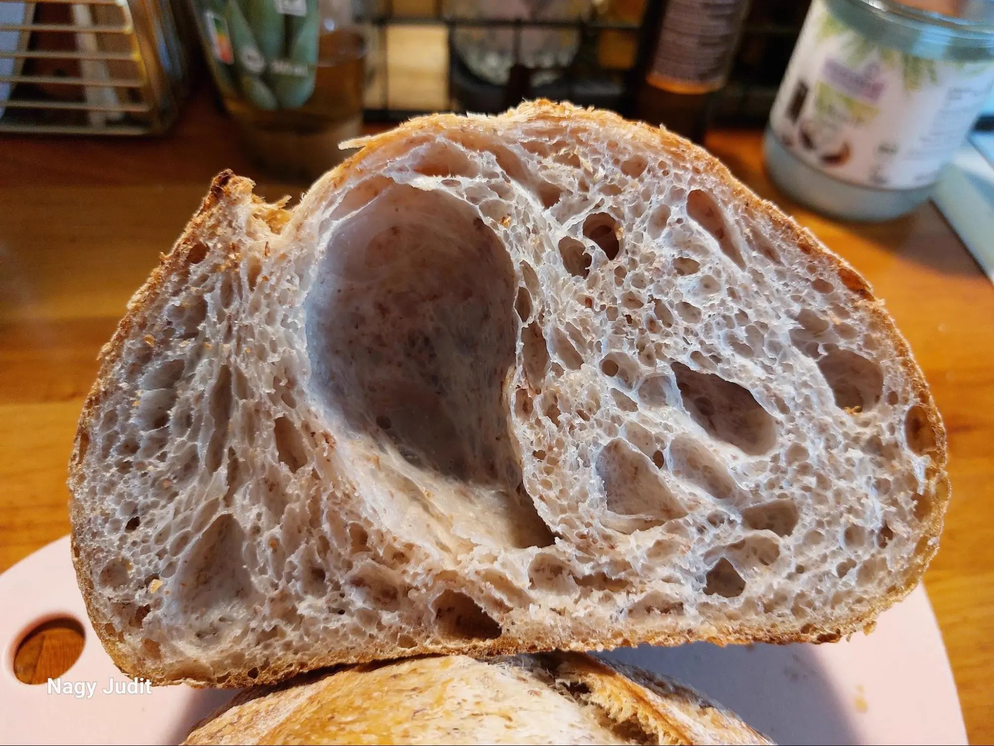 Nagyon elégedett voltam vele, csodásan dolgozott végig a tészta. A nagy lyuk az én hibám mert túl finoman formáztam, de a szerkezete csodás lett.