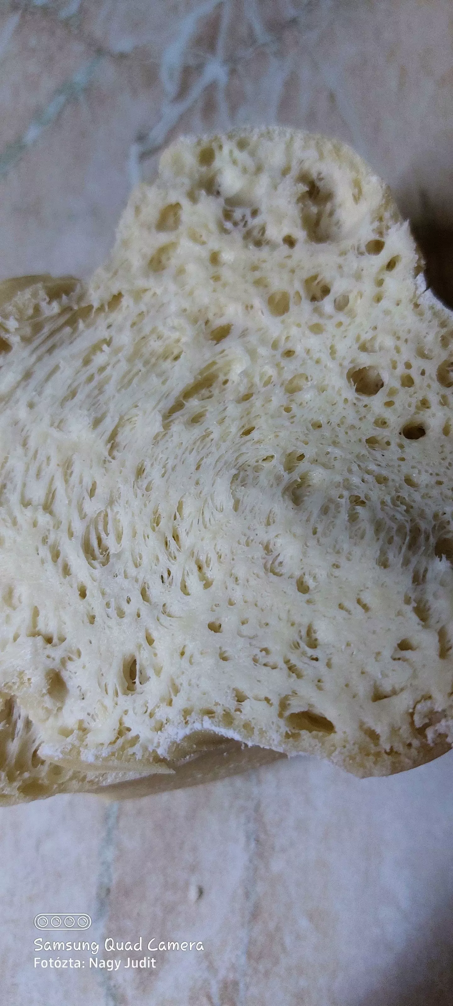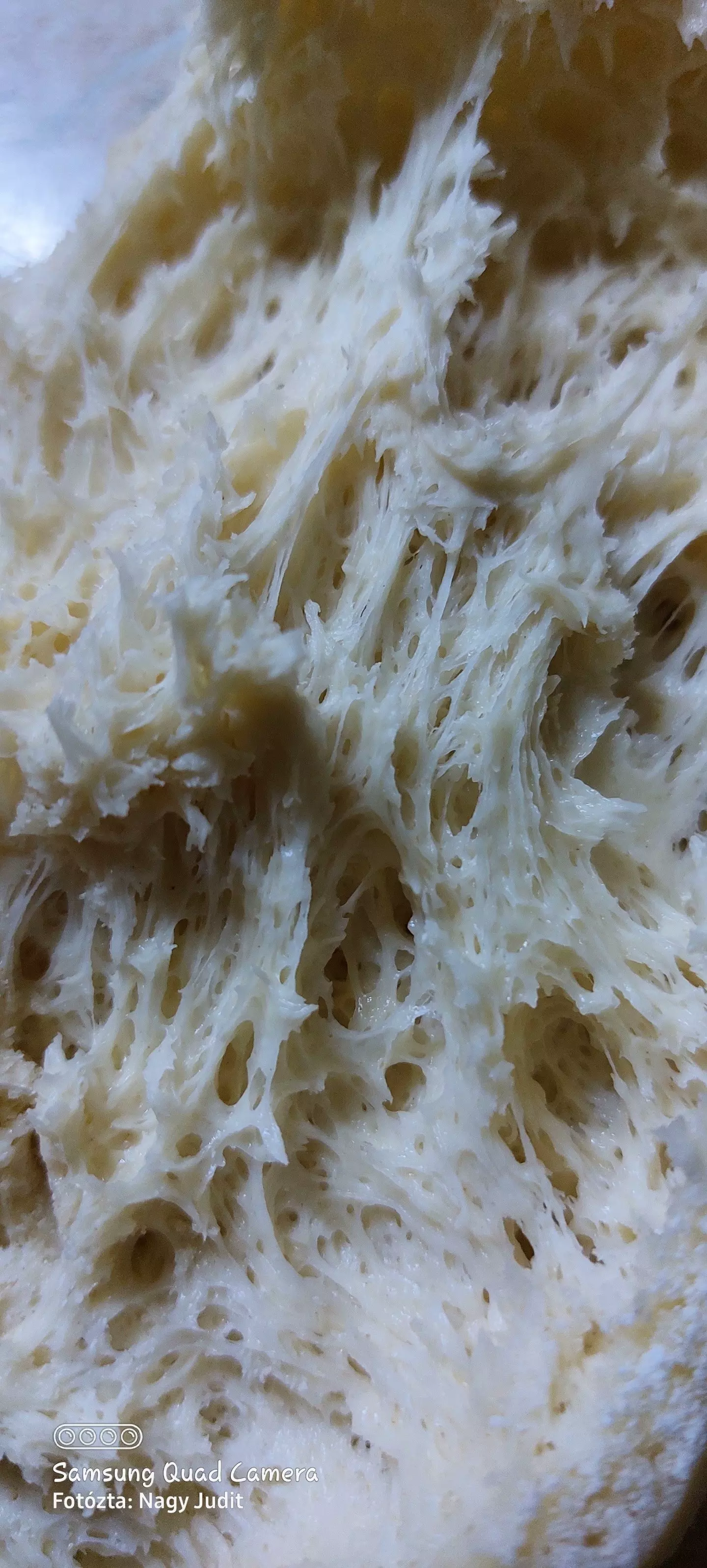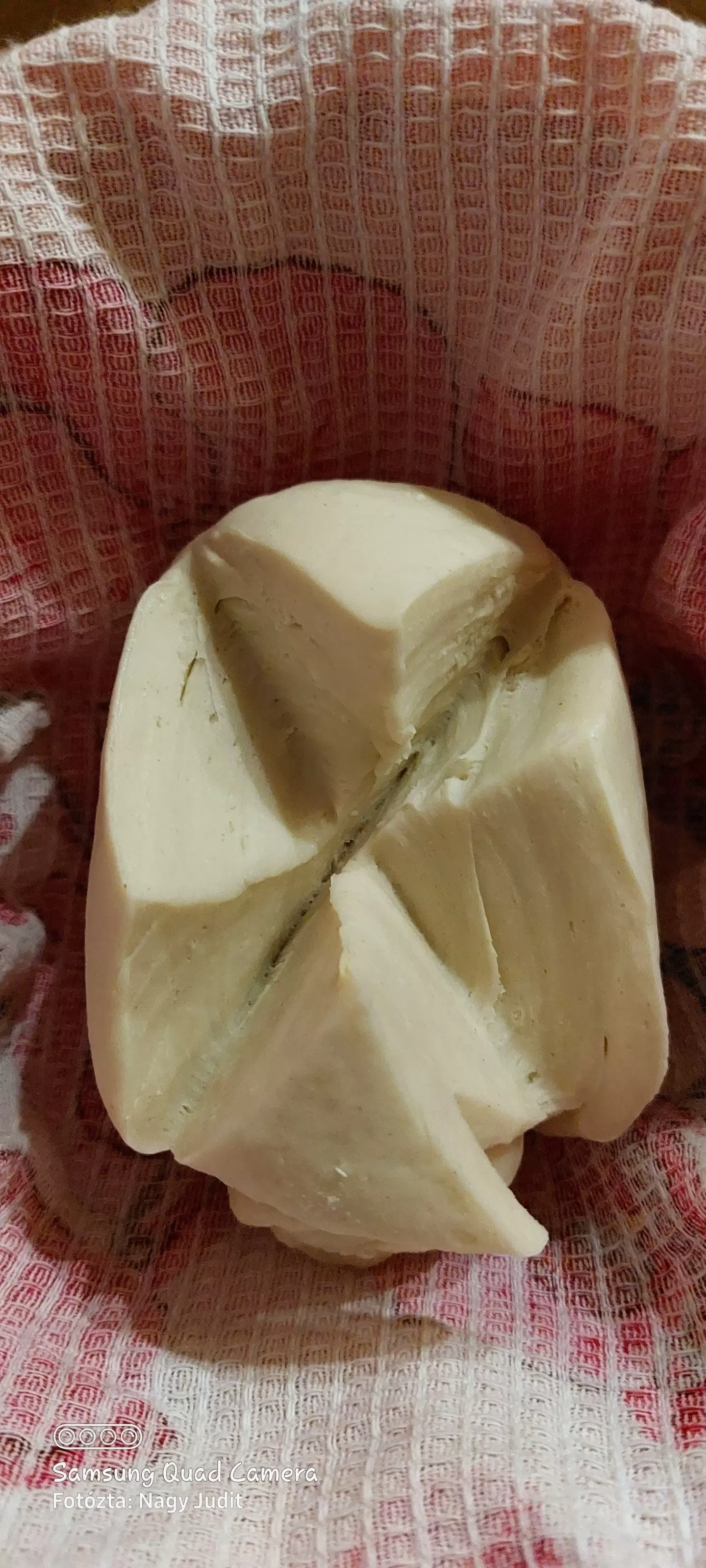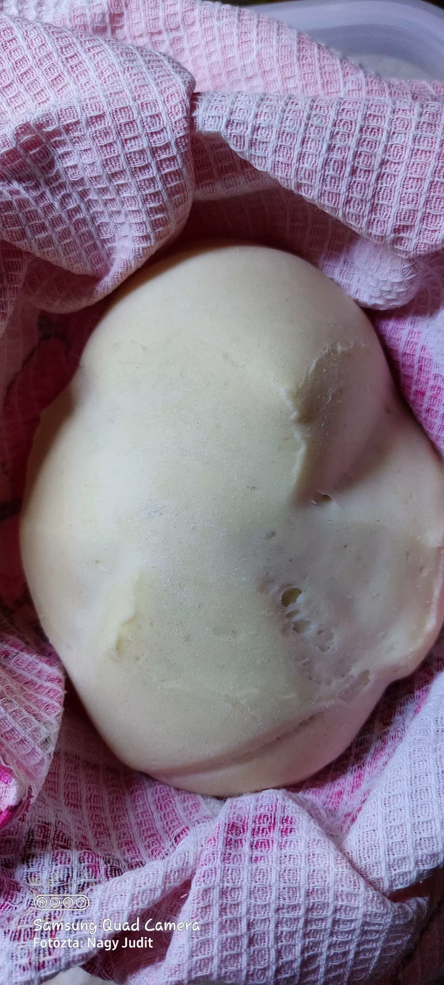 Ugyan ugy mint eddig annyi változással hogy a teteje megszárad és alóla kell a szivéből kivenni az eteni kivánt mennyiséget. Ahogy sa jalapját levettem és szétvágtam egy gyönyörű lyukacsos belső fogadott. 3 óra mulva ment a hűtőbe máshogy nem boldogultam vele. Mire a hűtőbe került márvszépen megnőtt, de óránként meglestem a hűtőbe is és csak nőtt meg nőtt ugy hogy megnyugodtam jóhelye lesz a hidegben. Így megint 48 óra mulva etettem.