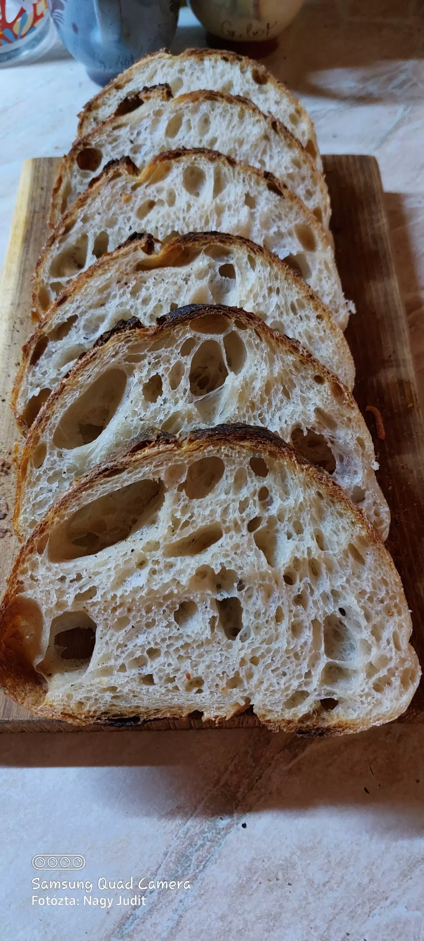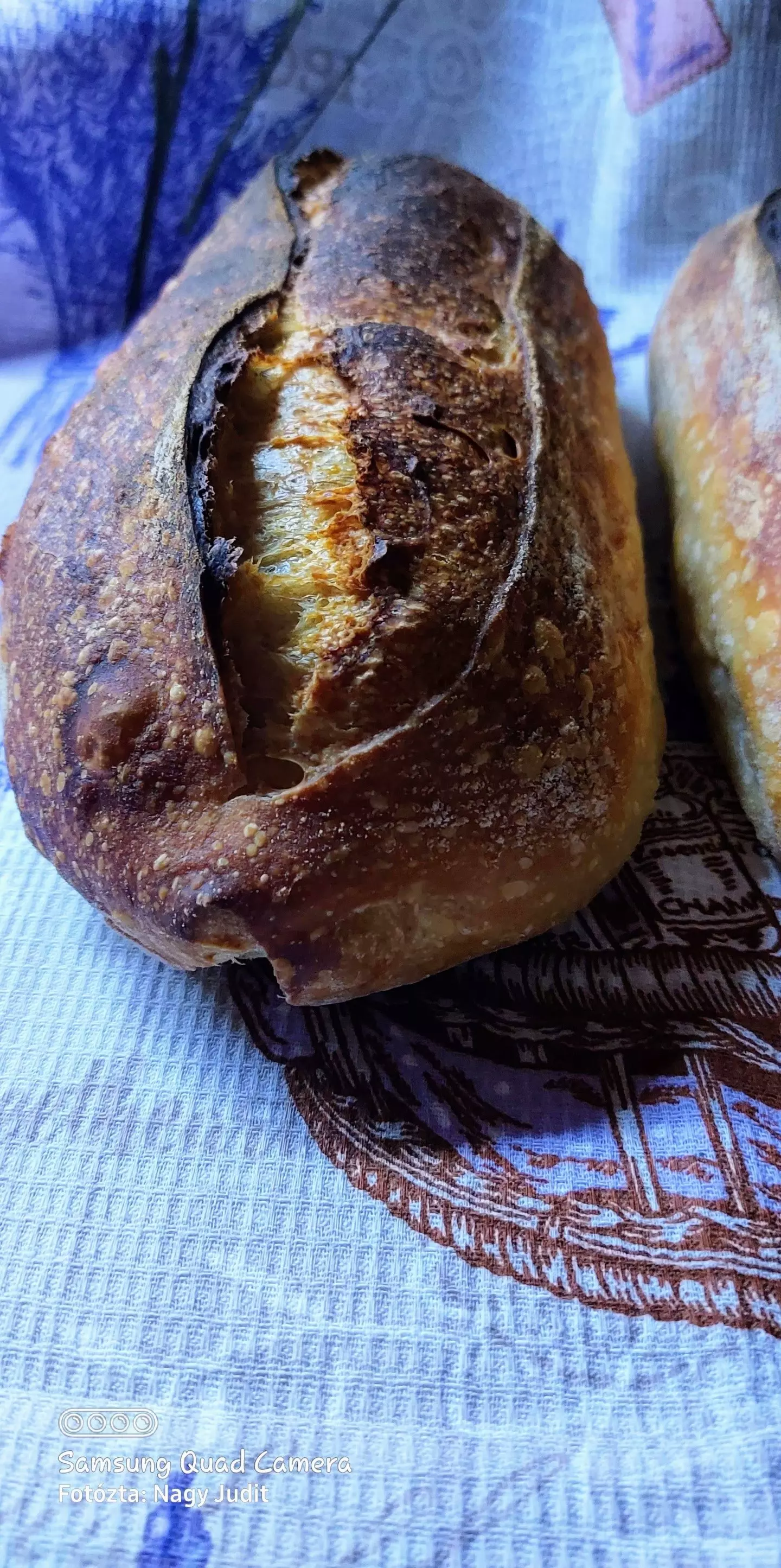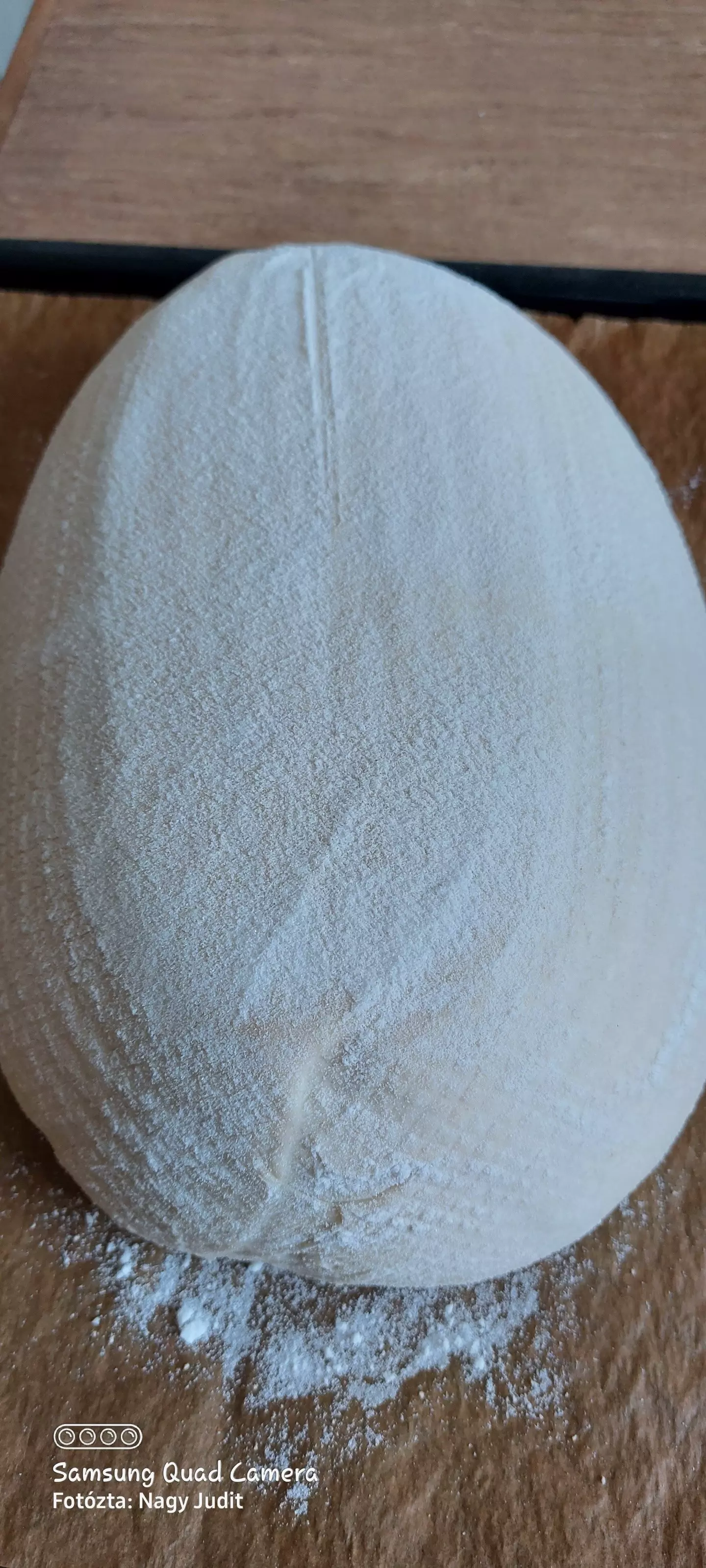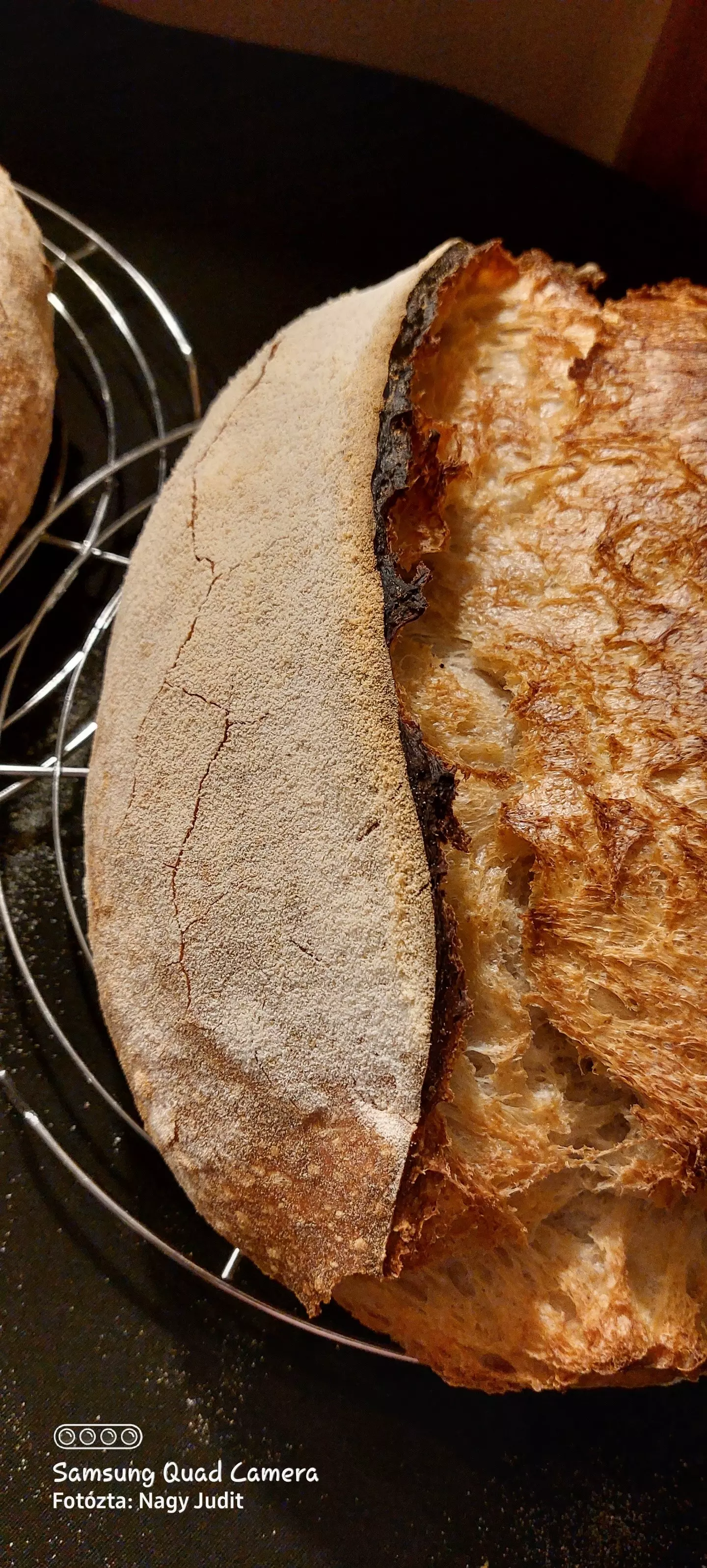 Délután újabb bevetésen a madre! Igy újra etettem 2 óra mulva hűtő. Dagadztás az előzőek szerint annyi válltozás hogy nem került bele tk liszt csak világosak és sajnos nem tudom hogy miből mennyi mert a vizet mértem és a madret de a lisztnél nem kapcsoltam visdza a mérleget igy kelkett hozzá még jócskán víz ugy hogy a madre kb 15 % lehetett 5,5 volt a bulk 21 óra hützőzés és összesen 3 óra pult 1 óra formázás után kb 2 óra hűtő után. Ő lett a 2 fele osztott tészta kelesztés után nagyon szép lett!