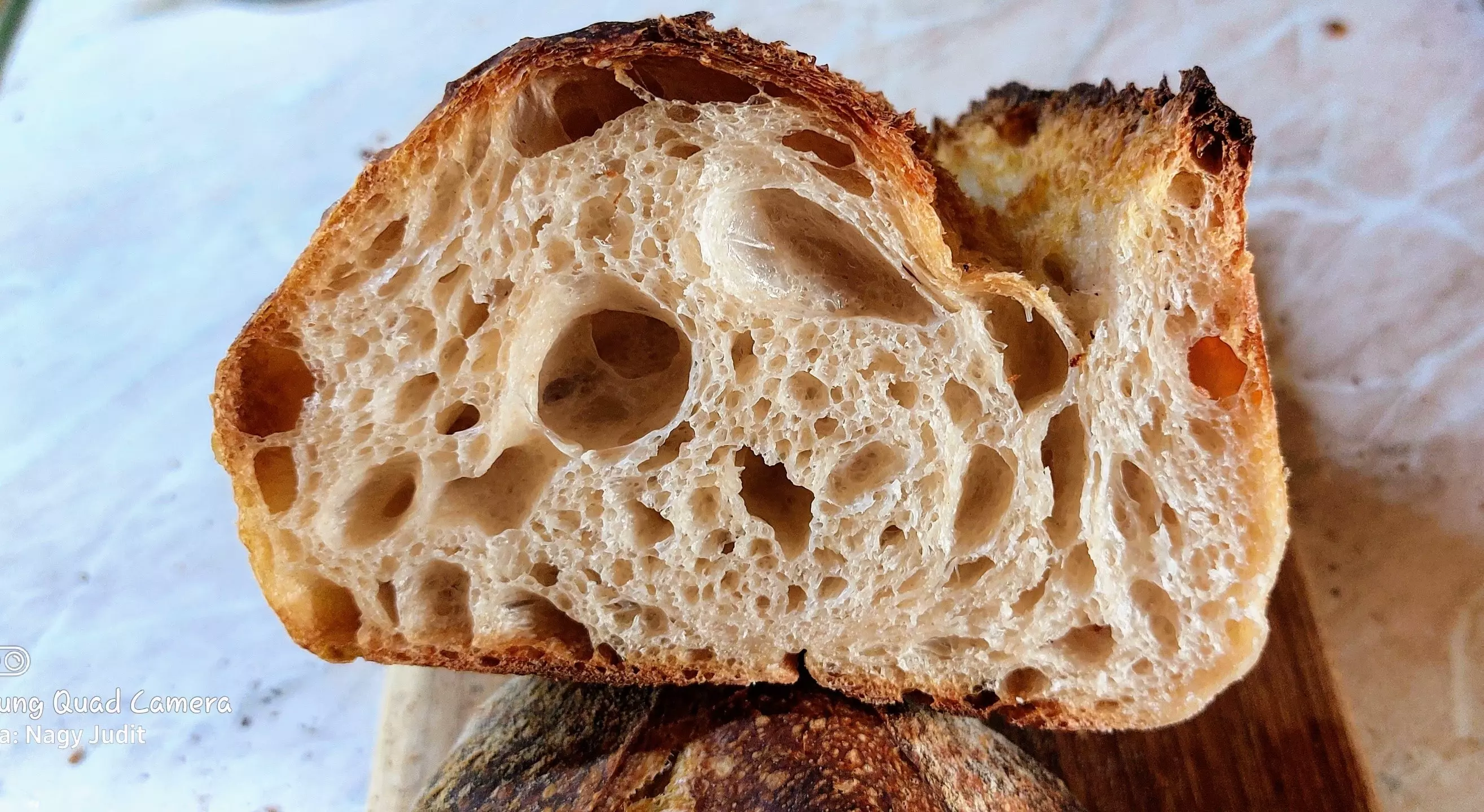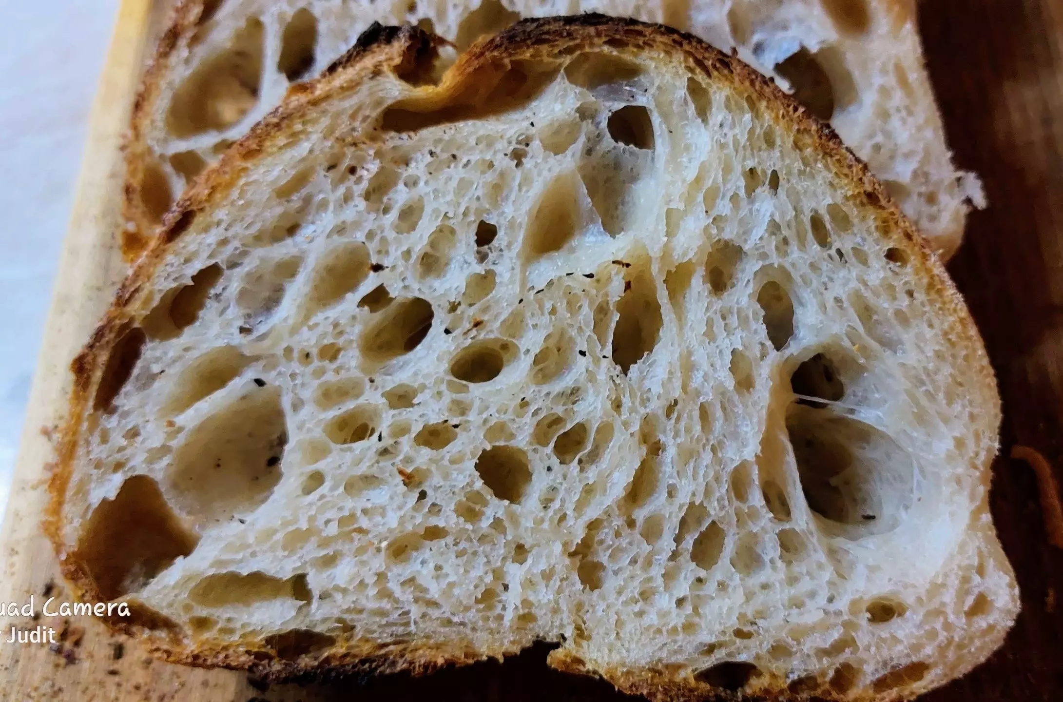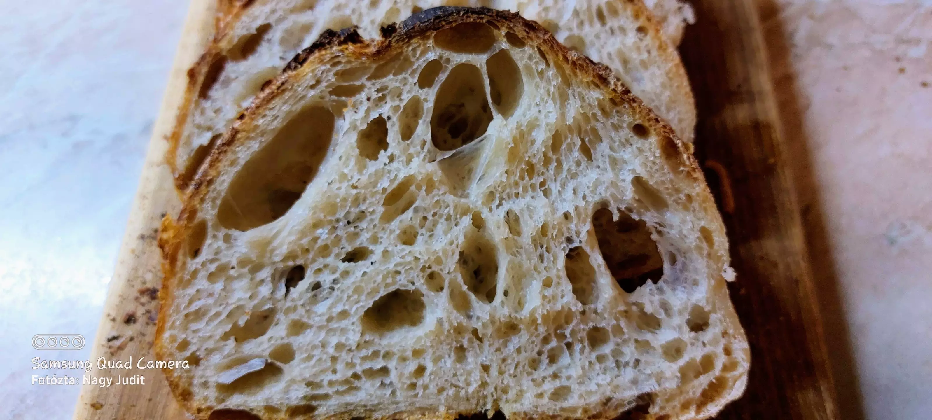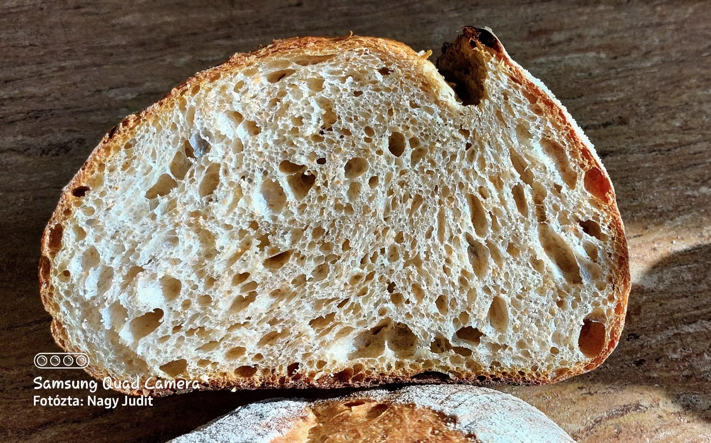 Délután újabb bevetésen a madre! Igy újra etettem 2 óra mulva hűtő. Dagadztás az előzőek szerint annyi válltozás hogy nem került bele tk liszt csak világosak és sajnos nem tudom hogy miből mennyi mert a vizet mértem és a madret de a lisztnél nem kapcsoltam visdza a mérleget igy kelkett hozzá még jócskán víz ugy hogy a madre kb 15 % lehetett 5,5 volt a bulk 21 óra hützőzés és összesen 3 óra pult 1 óra formázás után kb 2 óra hűtő után. Ő lett a 2 fele osztott tészta kelesztés után nagyon szép lett!