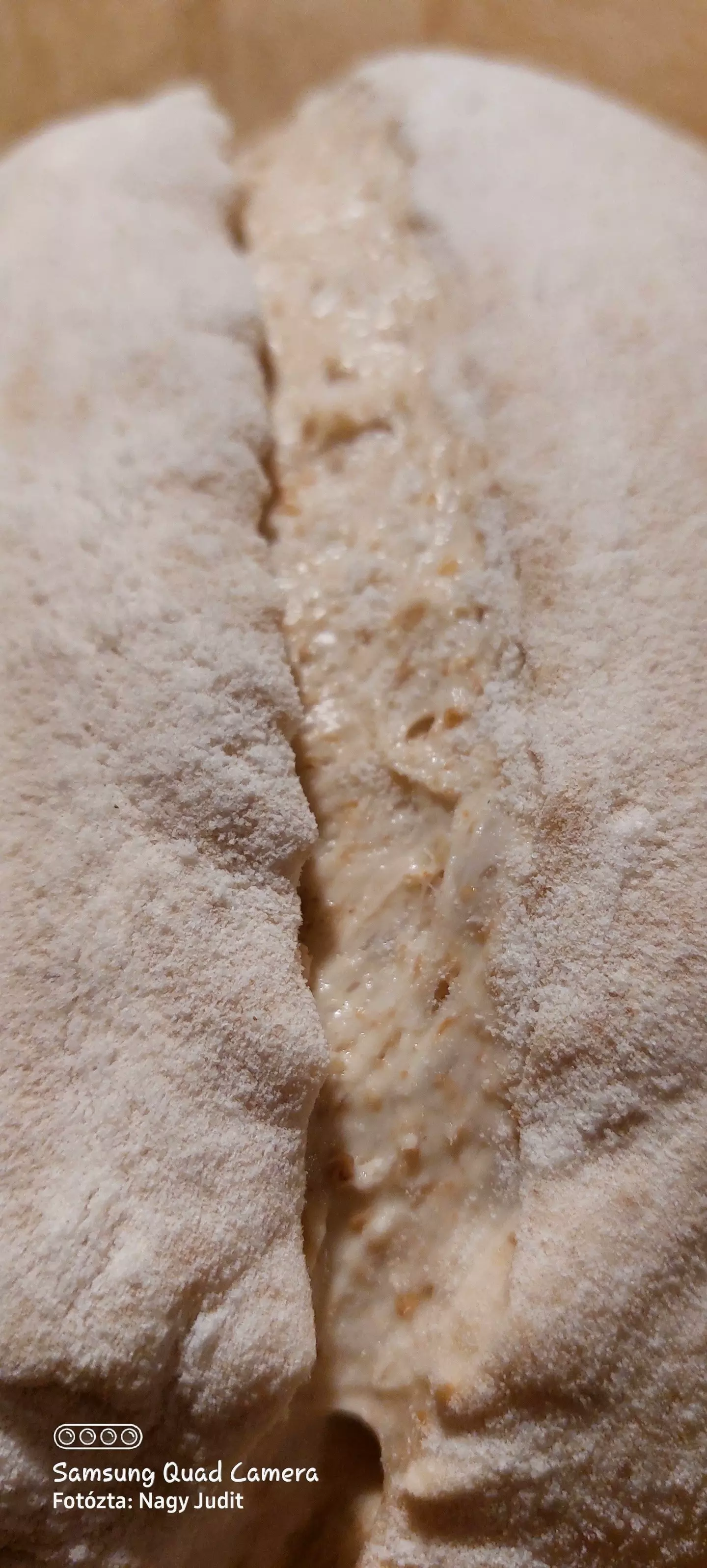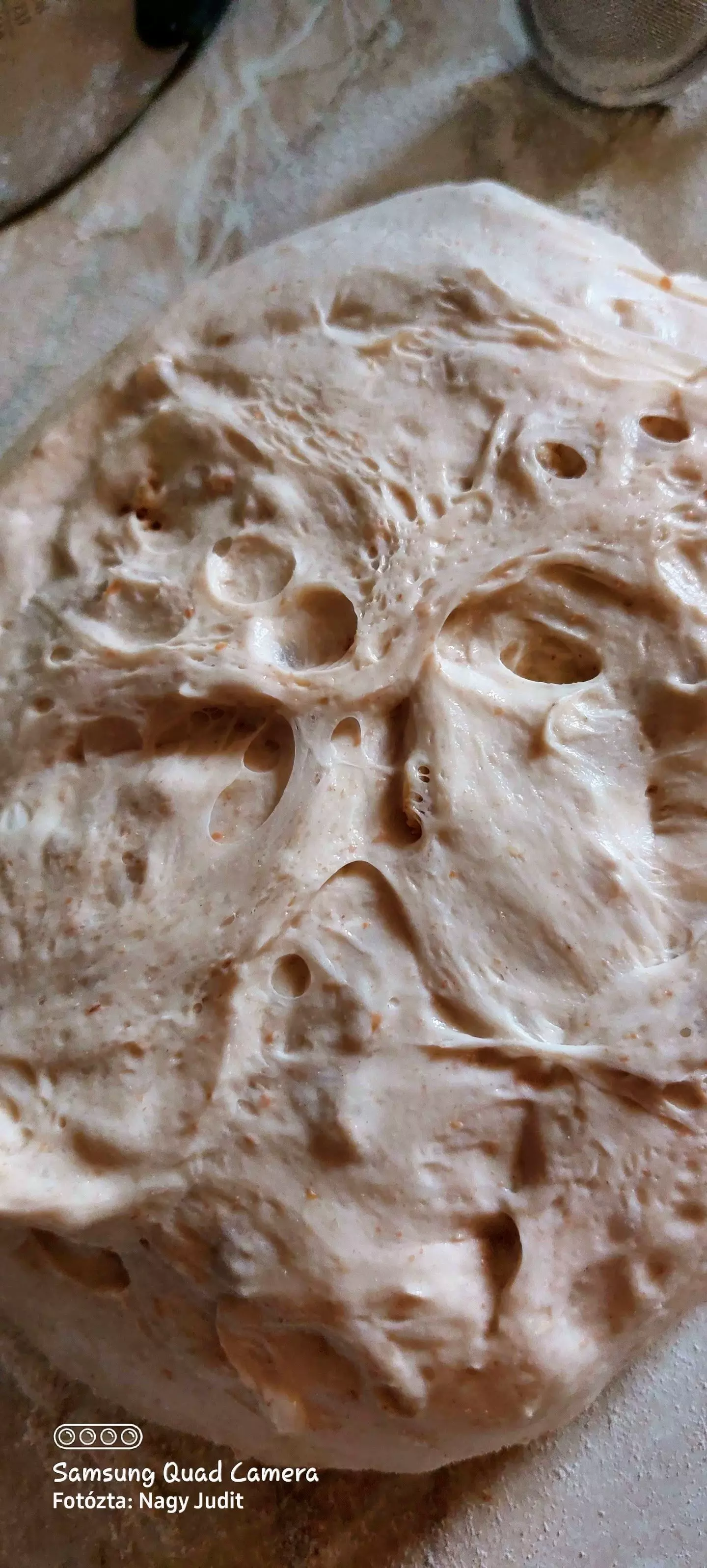 Egy homogén tésztát kapunk pulton 3x kis pihenőkkel jól átgyurjuk mintha feltekernénk majd golyót formázunk és megy a tiszta üvegbe ugyanugy nem csavarjuk rá a tetőt hagyjuk pihenni 24-48 órát. Több mint duplájára nől.