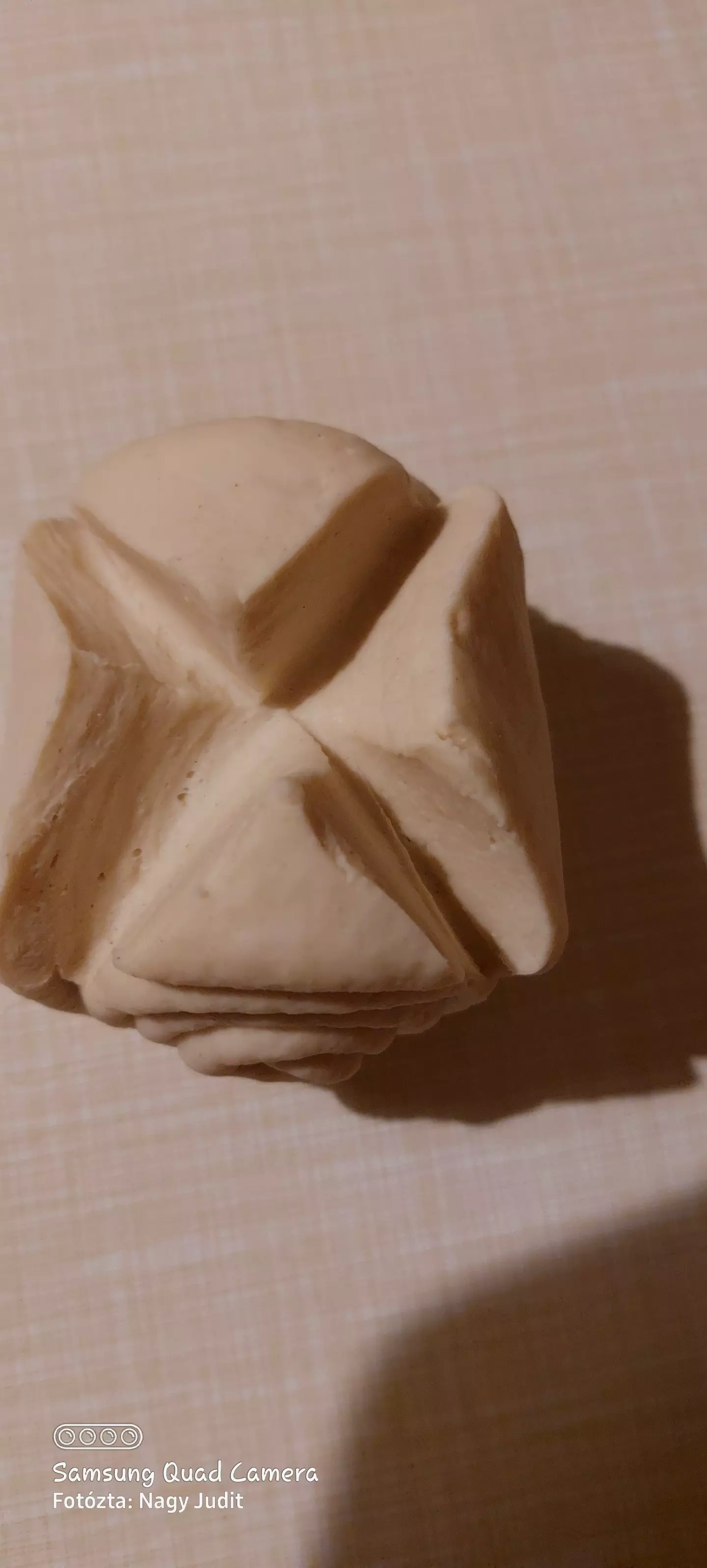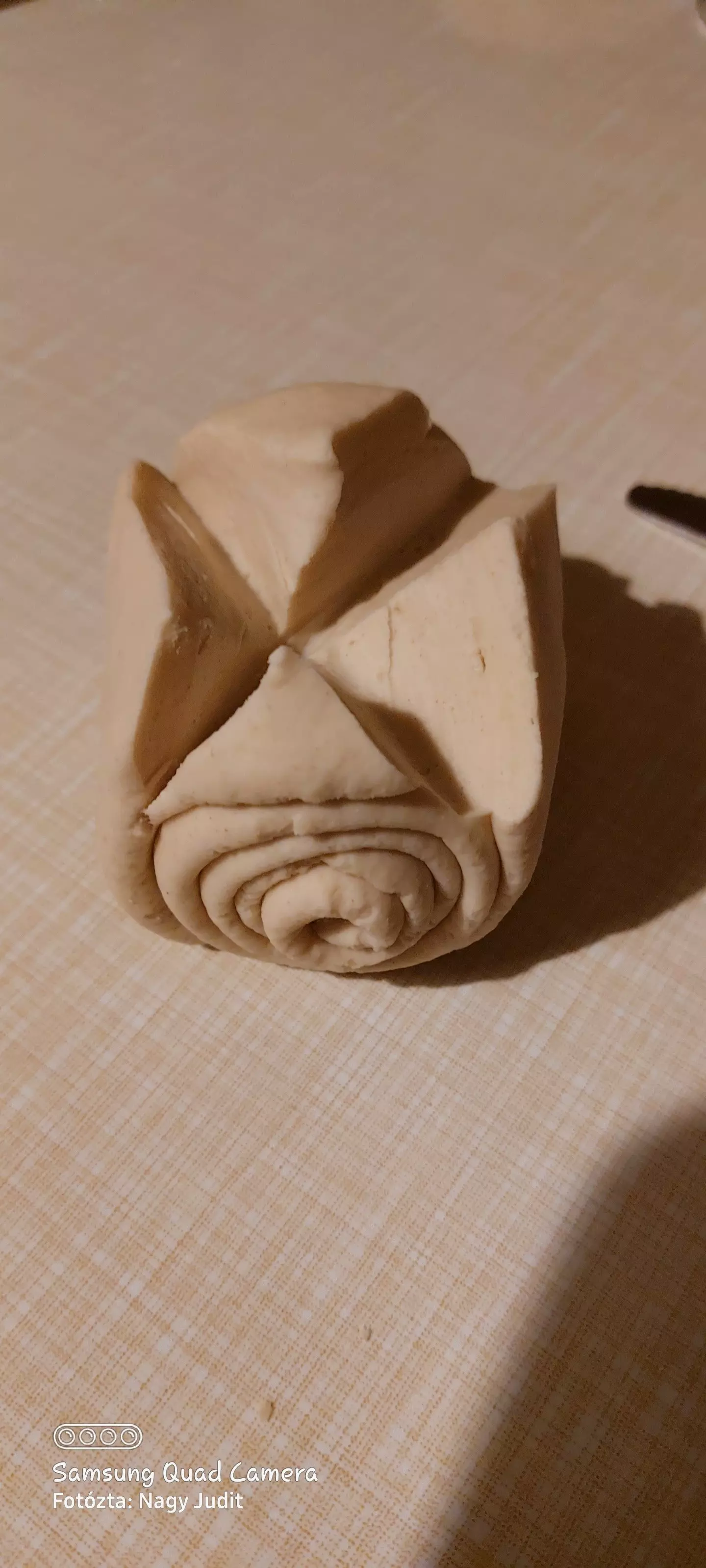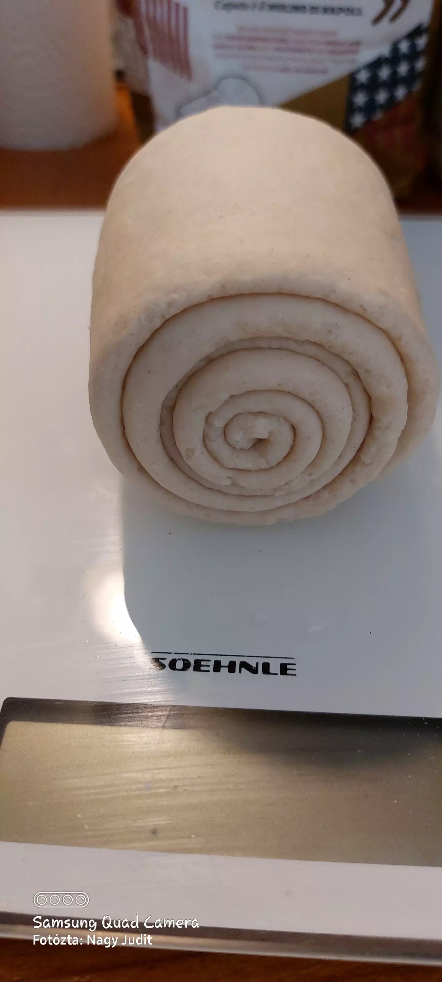 Korábbiak szerint megetetve 3x pogácsa hajtás kis nyujtásokkal majd kicsit vékonyabra nyujtás 2 oldalról egymásra hajtás szük cdikot kapunk ezt nyujtjuk kb 50 cm hosszúra és feltekerjük. 2 óra pult és megy a hűtőbe. 3 óra jobb lett volna de már kèső volt. Az 5 fokos hűtő nem igazán tetszik neki a 8 fok pedig már inkább sok valahol a kettő közt kell megtalálni az arany középutat. Éjszaka volt 5 fokon reggel néztem nem igazán fejlődött tovább igy most kicsit kiveszem és csinálok neki kicsit jobb időt!
