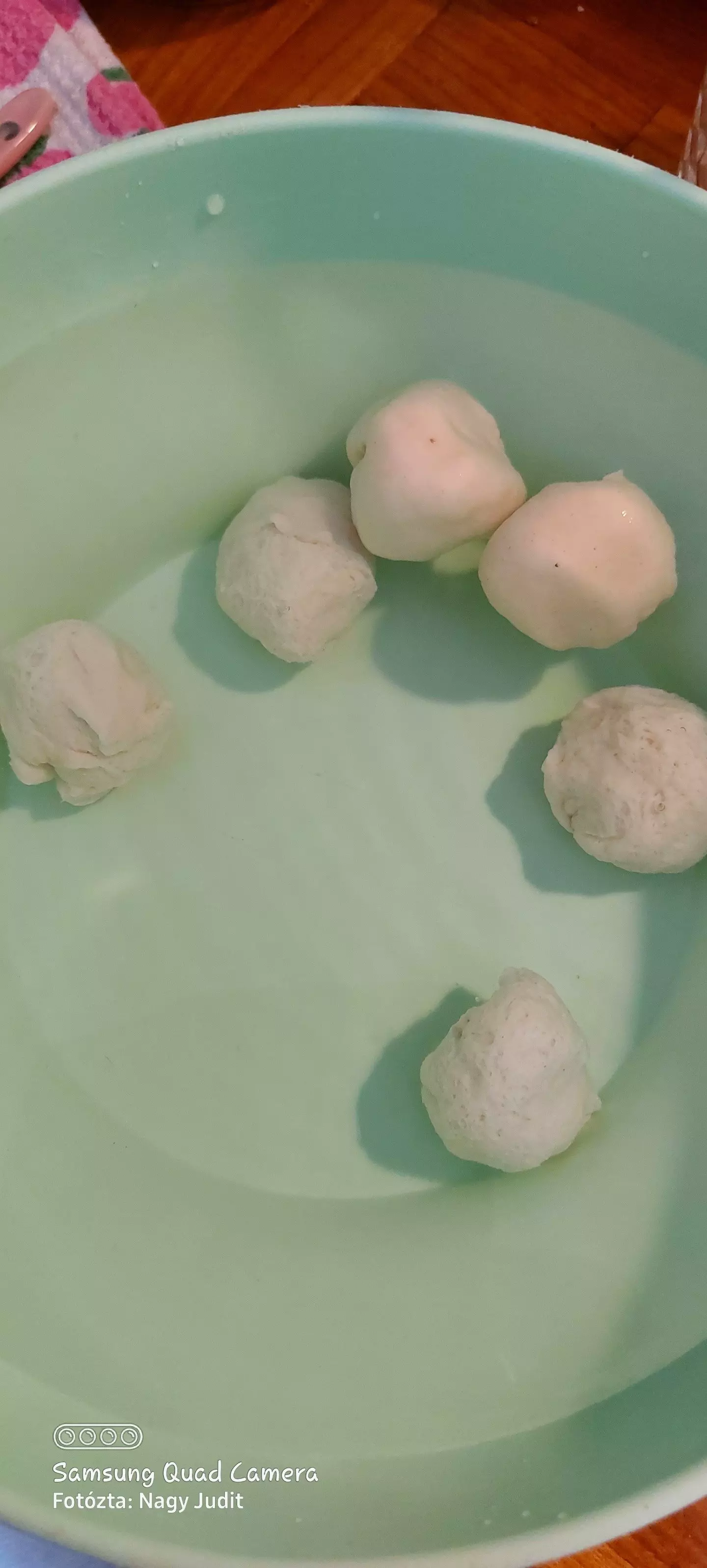 A másik feléből kis golyókat formáztam és beletettem langyos cukros vízbe hogy azt is megtudjam mutatni ha esetleg legyengülne a madre hogy lehet kicsit feltuningolni. Az erősség látszik azon hogy a cukros vízben milyen hamar kezd el lebegni. A z enyém nyilván erős mivel pár perc mulva már a víz tetején úszott pedig előtte a gombócozásnál kinyomtam belőle a levegőt. így nem is hagytam benbe tovább csak a fotó kedvéért fürdettem meg őket. Ahogy nyomkodtam ki belőle a vizet lehet érezni ahogy a buborékok pattogtak szét a madreban.