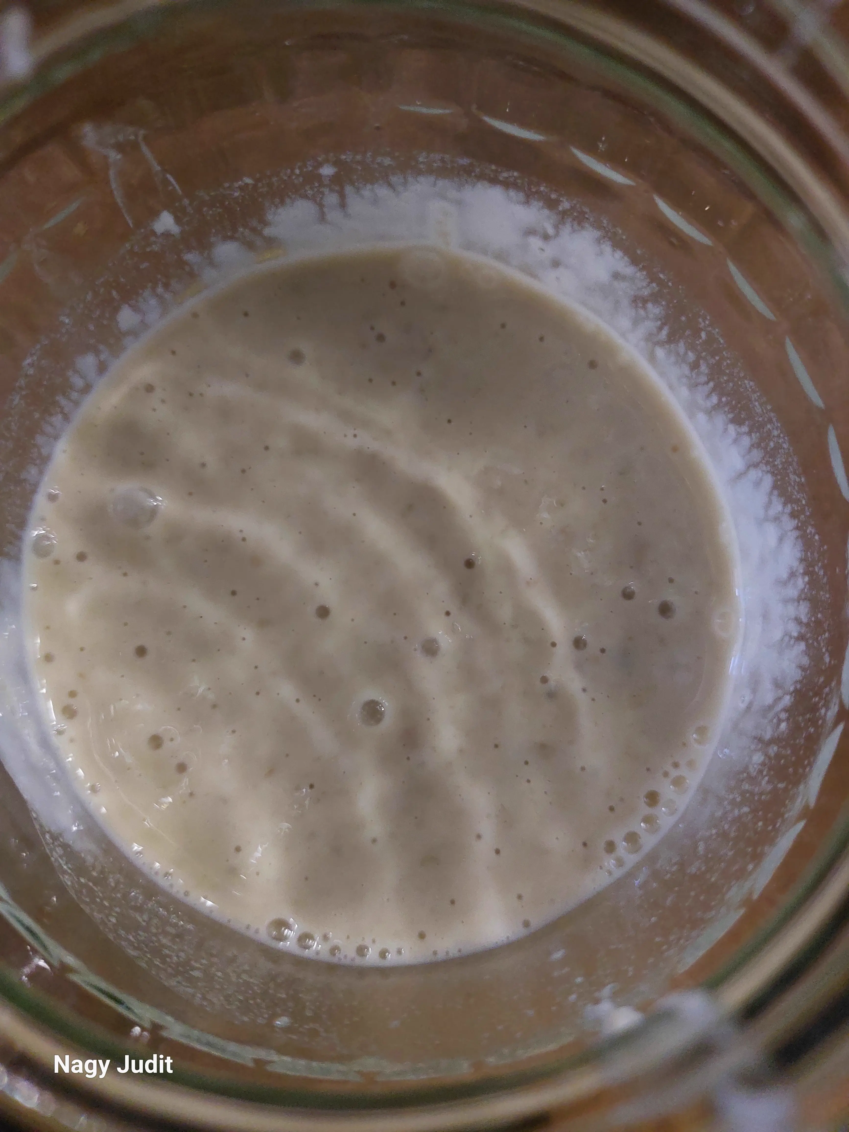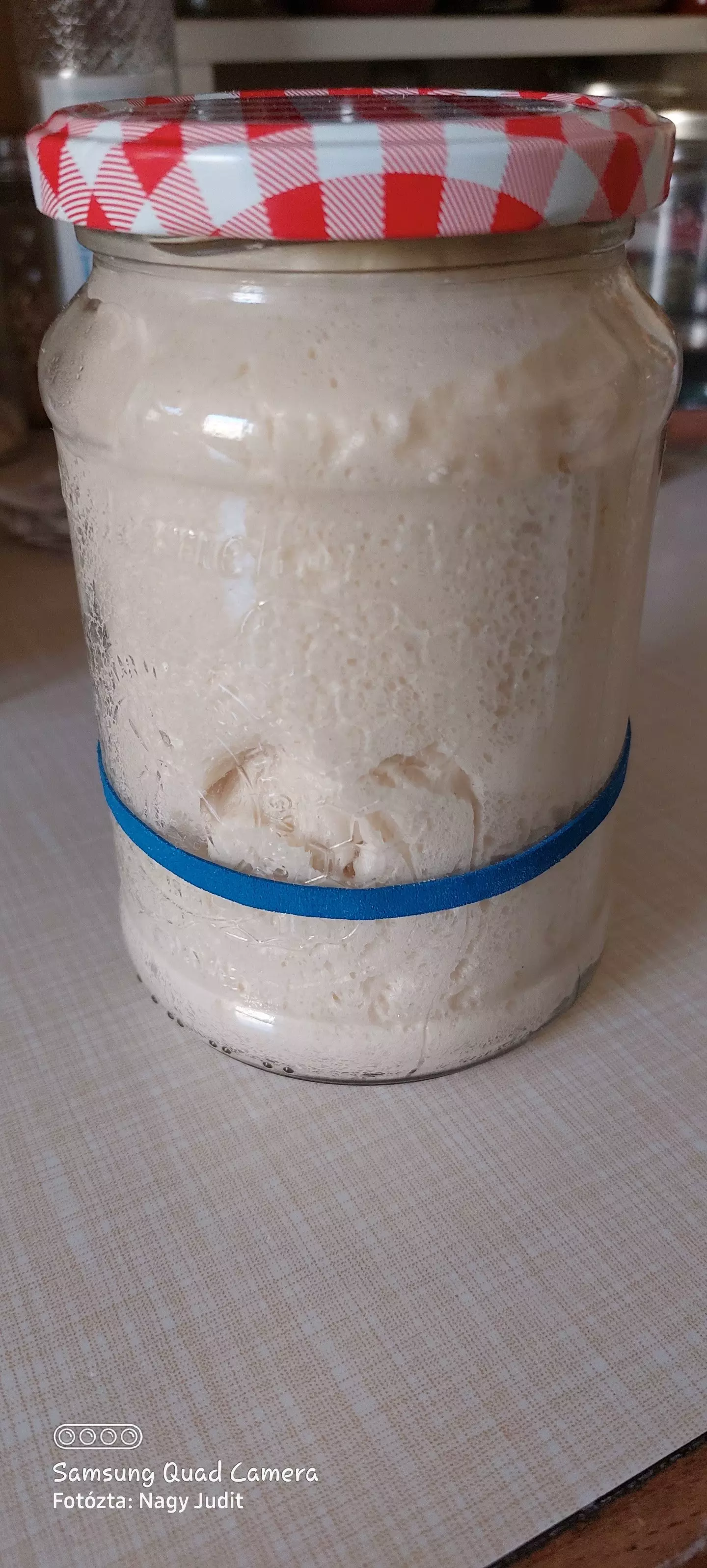 Innentől ugyanugy kezeltem mint az anyát annyi kivétellel hogy üvegbe tettem, a tetőt nem csavartam rá csak rátettem. 2 kenyér készül majd egy pici 50%-ban tk búzalisztes és egy fehér.